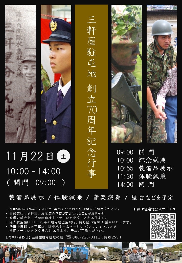 陸上自衛隊 三軒屋駐屯地 創立70周年記念行事(岡山県) - 2025年11月23日(日) 開催予定
