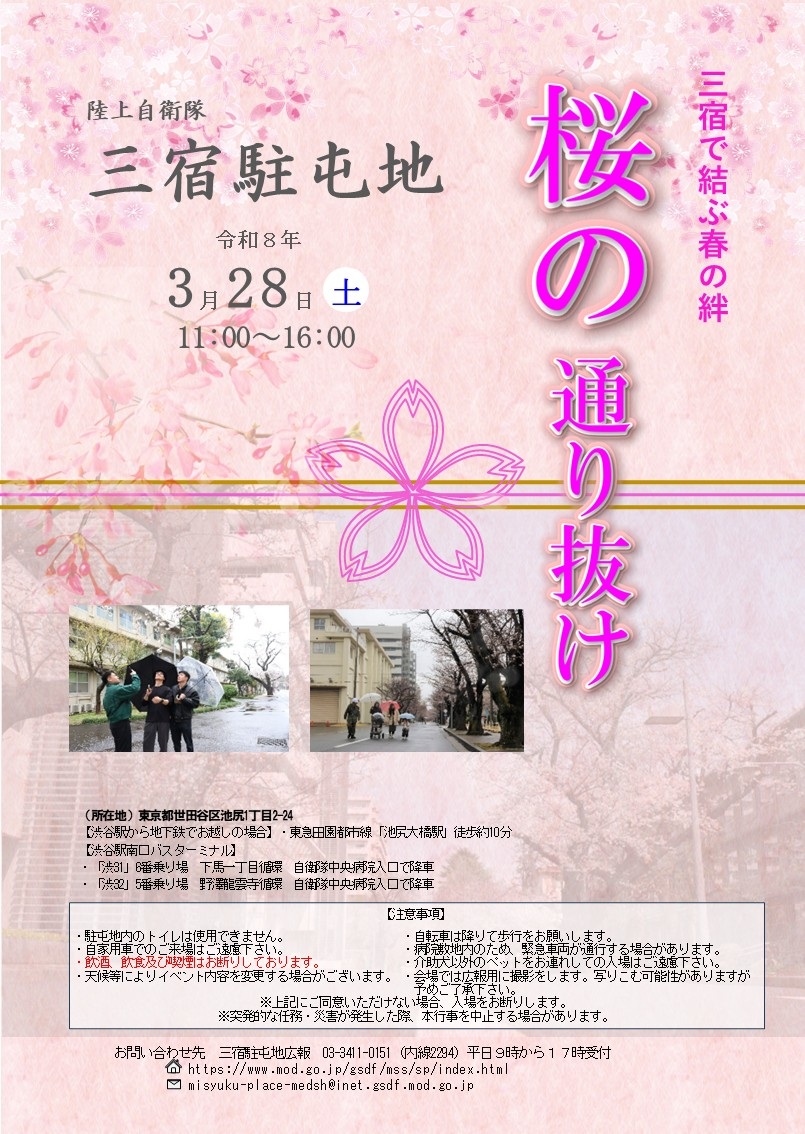 令和8年 陸上自衛隊 三宿駐屯地 桜の通り抜け(東京都) - 2026年3月28日(土)・29日(日) 開催予定