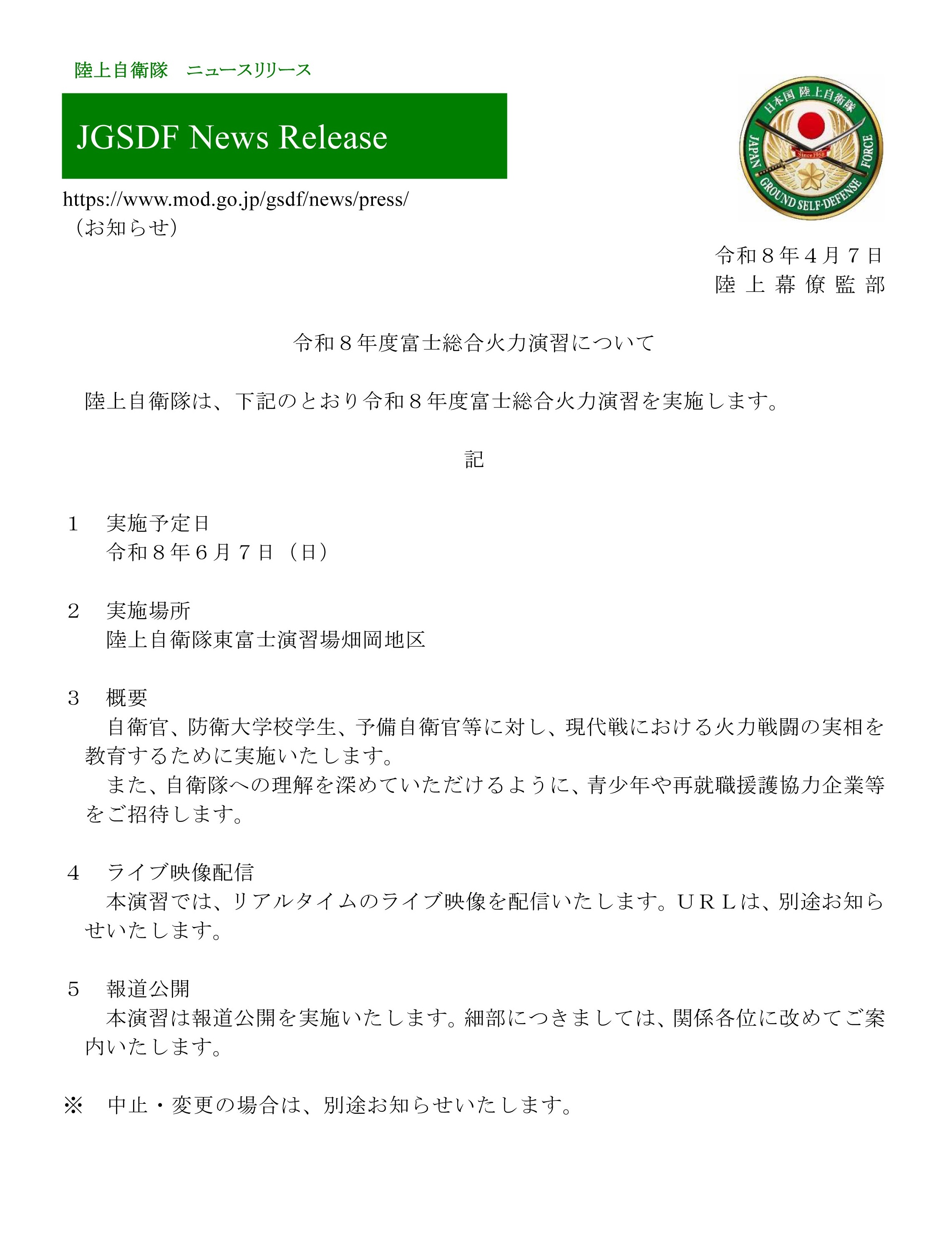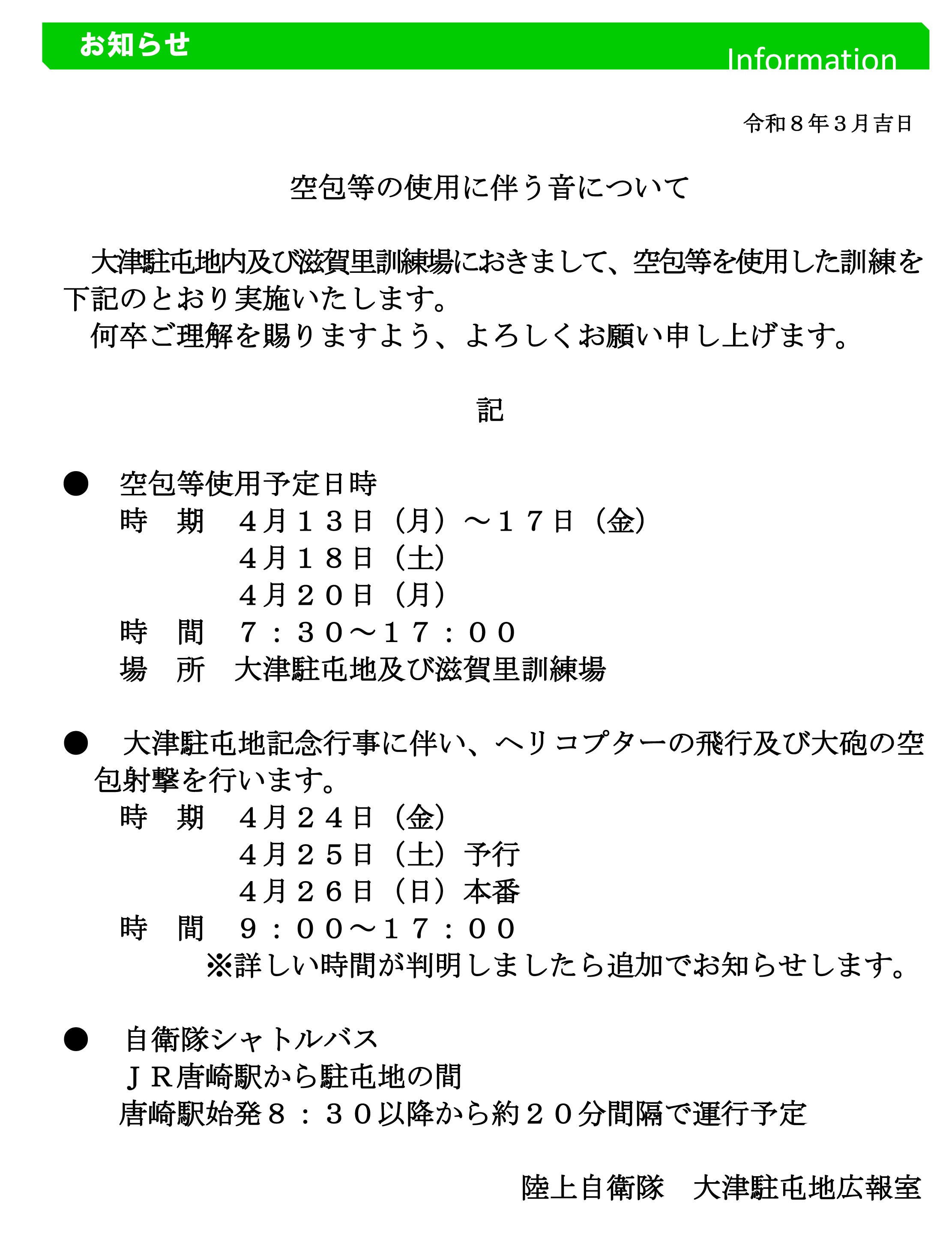 - 自衛隊などの行事参加案内(例:総合火力演習・部隊や施設等見学)