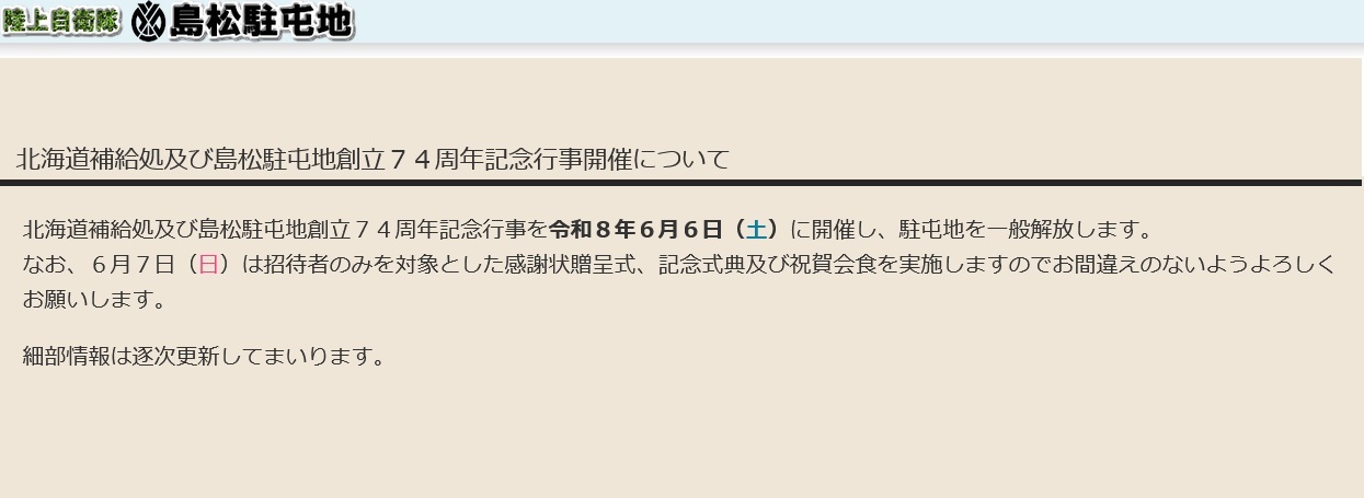 北海道補給処・島松駐屯地 創立74周年記念行事(北海道) - 2026年6月7日(日) 開催予定