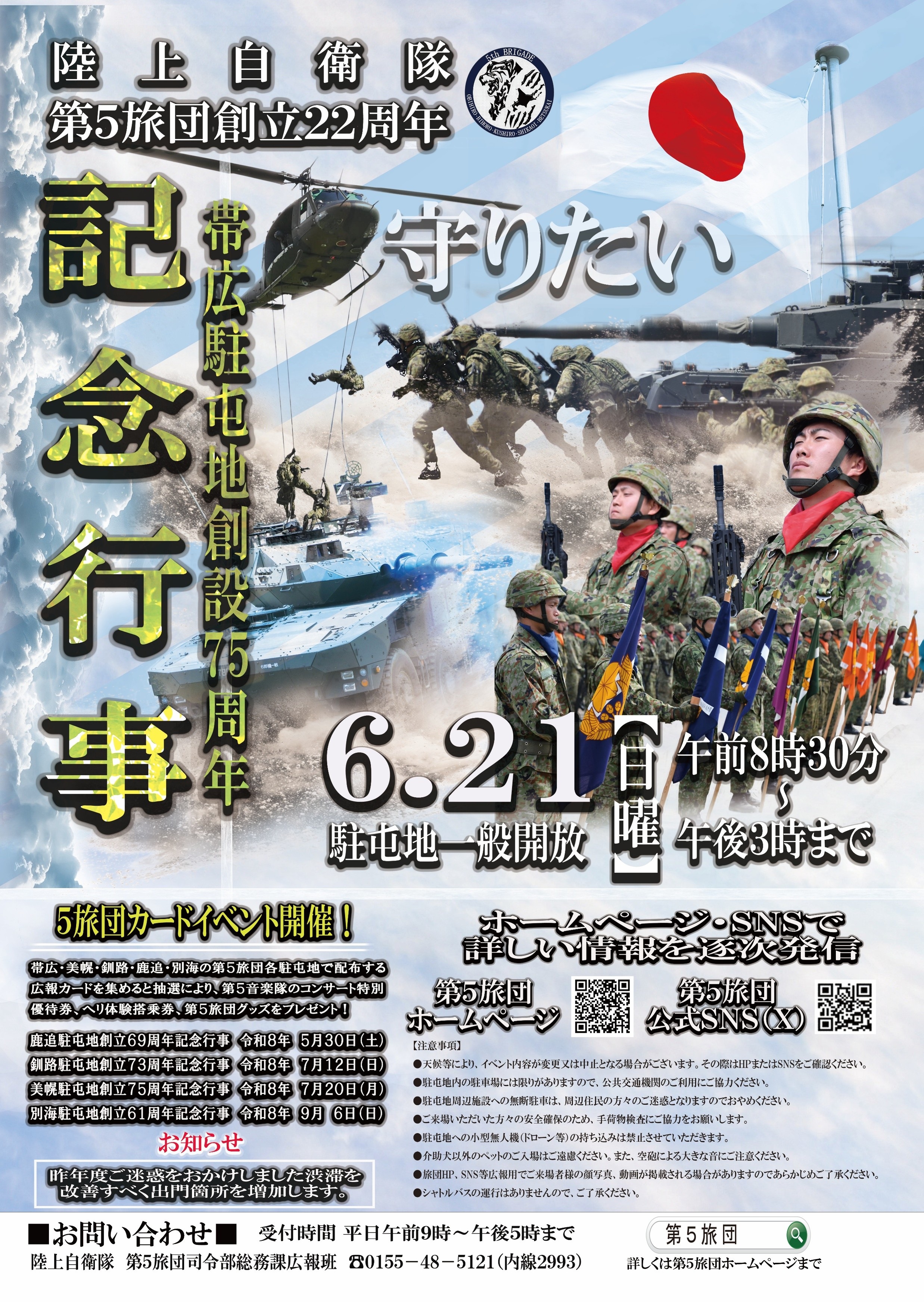 第5旅団 創立22周年・帯広駐屯地 創設75周年記念行事(北海道) - 2026年9月12日(土) 開催予定