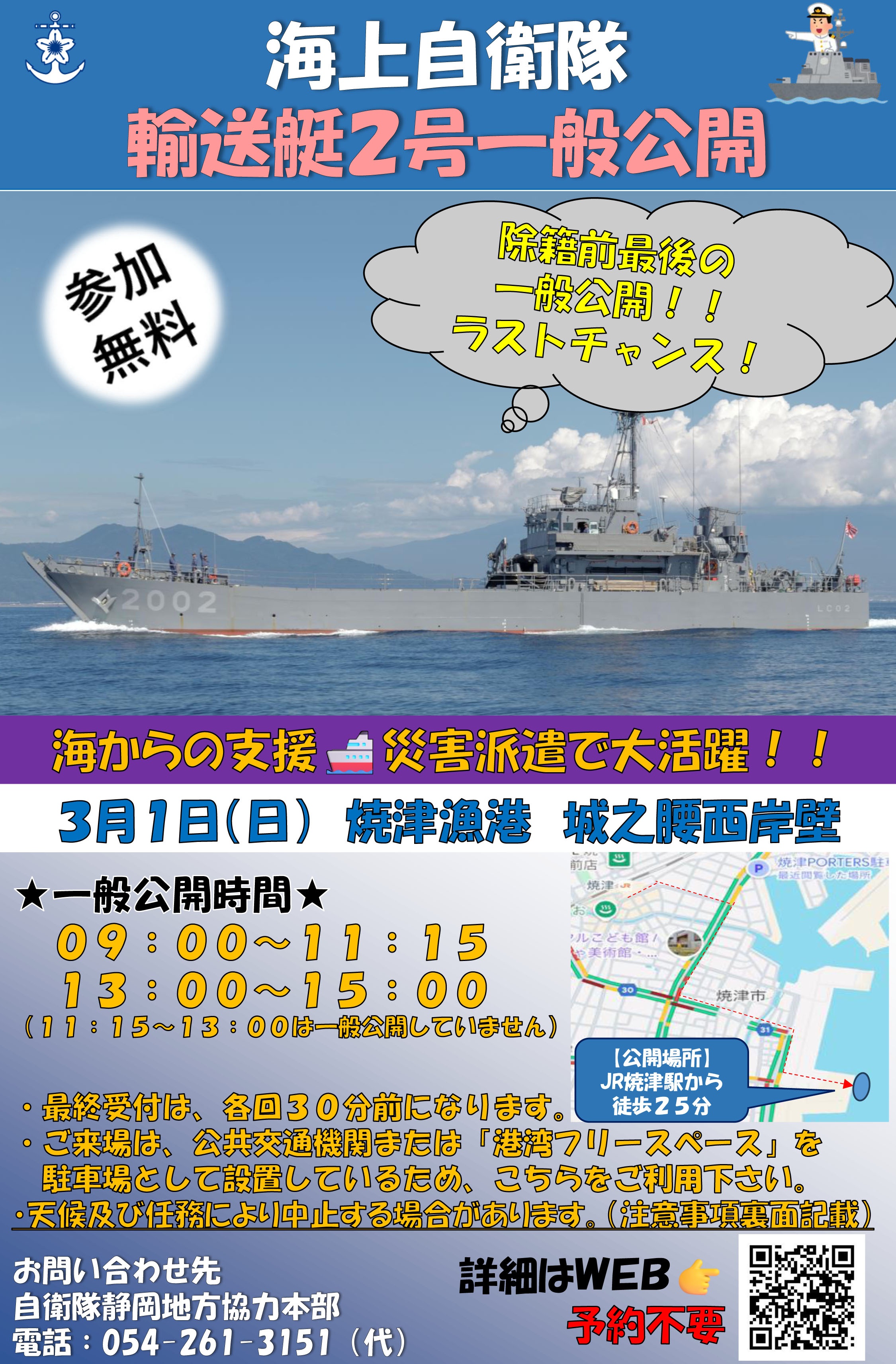 海上自衛隊 輸送艇2号 一般公開 in 焼津漁港 城之腰西岸壁 静岡地方協力本部(静岡県) - 2026年3月1日(日) 開催予定