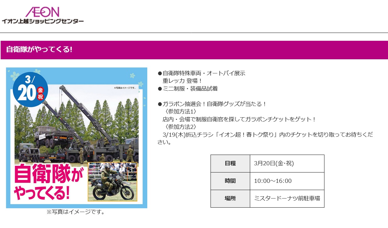 自衛隊がやってくる!2026春 in イオン上越ショッピングセンター 新潟地方協力本部(新潟県) - 2026年3月28日(土) → 一般開放中止在日米陸軍 キャンプ座間 日米親善桜祭り2026(神奈川県)