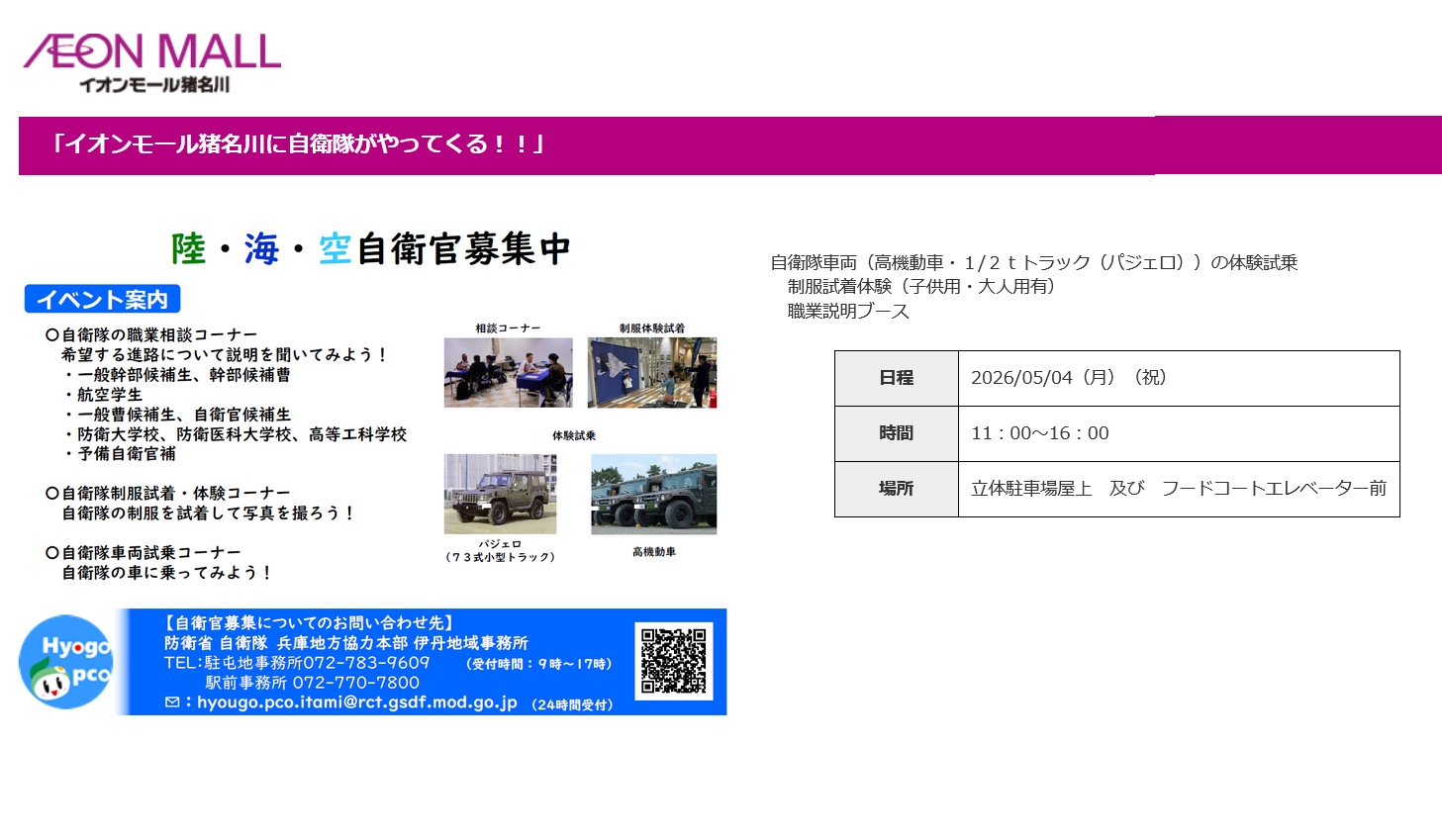 自衛隊ふれあいフェア2026 in アリオ加古川 兵庫地方協力本部(兵庫県) - 2026年5月10日(日) 開催予定