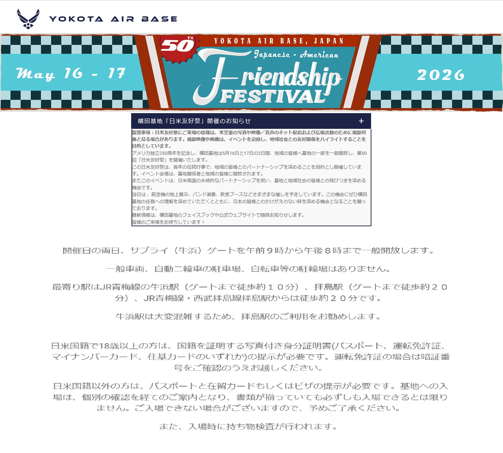 航空自衛隊 防府南基地 創立72周年記念行事(山口県) - 2026年3月21日(土) → 開催中止在日米海軍 横須賀基地 日米親善よこすかスプリングフェスティバル2026(神奈川県)
