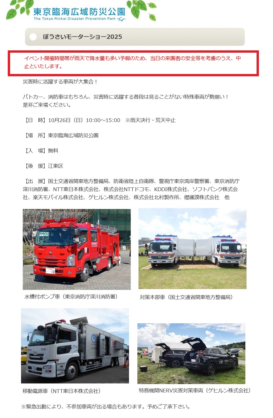 2025年10月26日(日)に予定されていた「ぼうさいモーターショー2025」は、イベント開催時間帯が雨天で降水量も多い予報のため、来場者の安全を考慮して開催中止になりました。