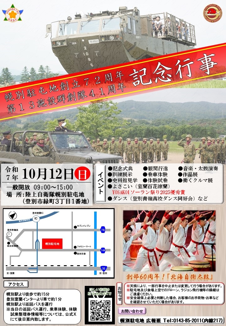 幌別駐屯地 創立72周年・第13施設群 創隊41周年記念行事(北海道) - 2025年10月12日(日)・13日(月・祝) 開催予定