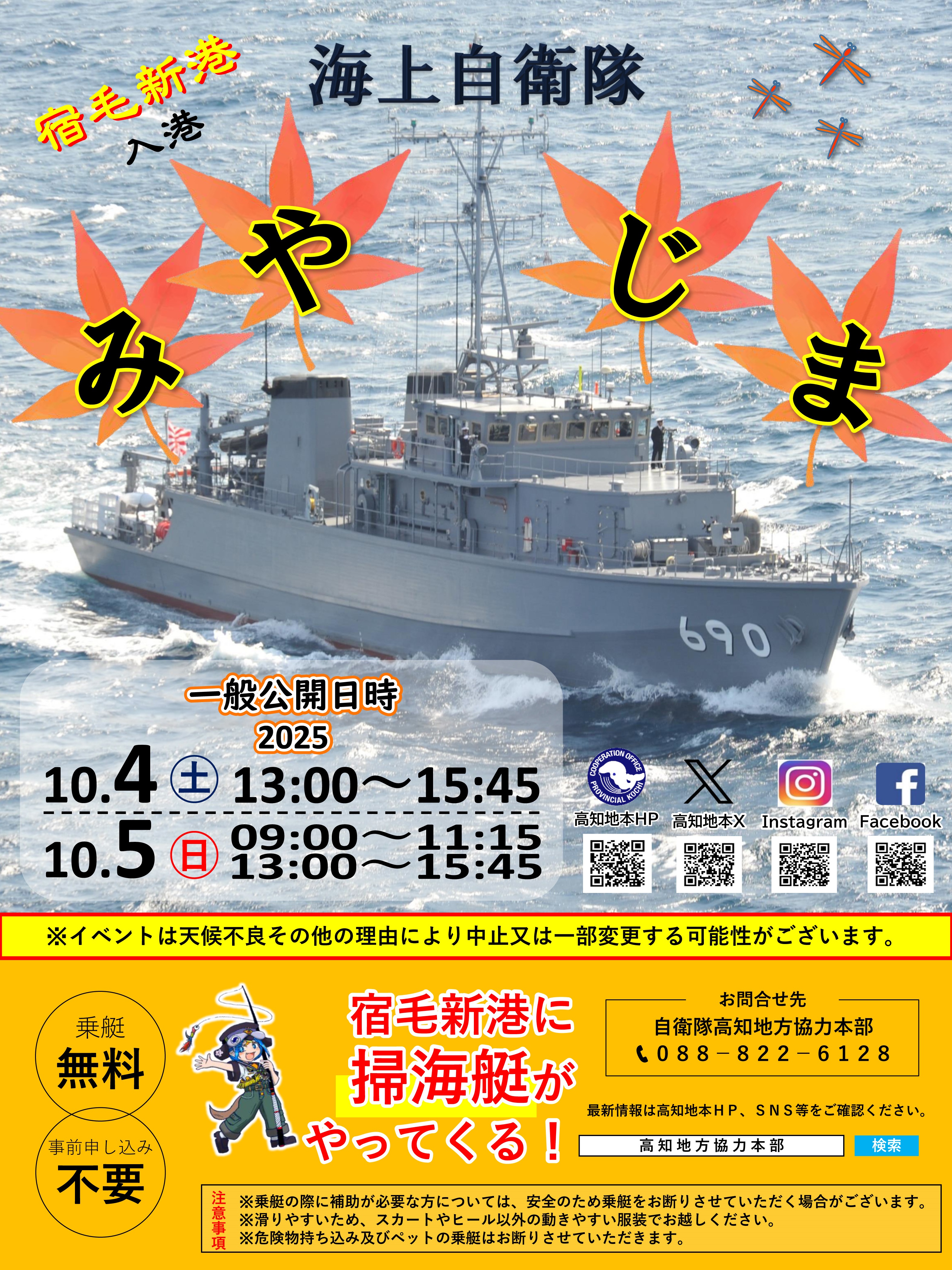 海上自衛隊 掃海艇「みやじま」一般公開 in 宿毛新港 高知地方協力本部(高知県) - 2025年10月5日(日) 開催予定