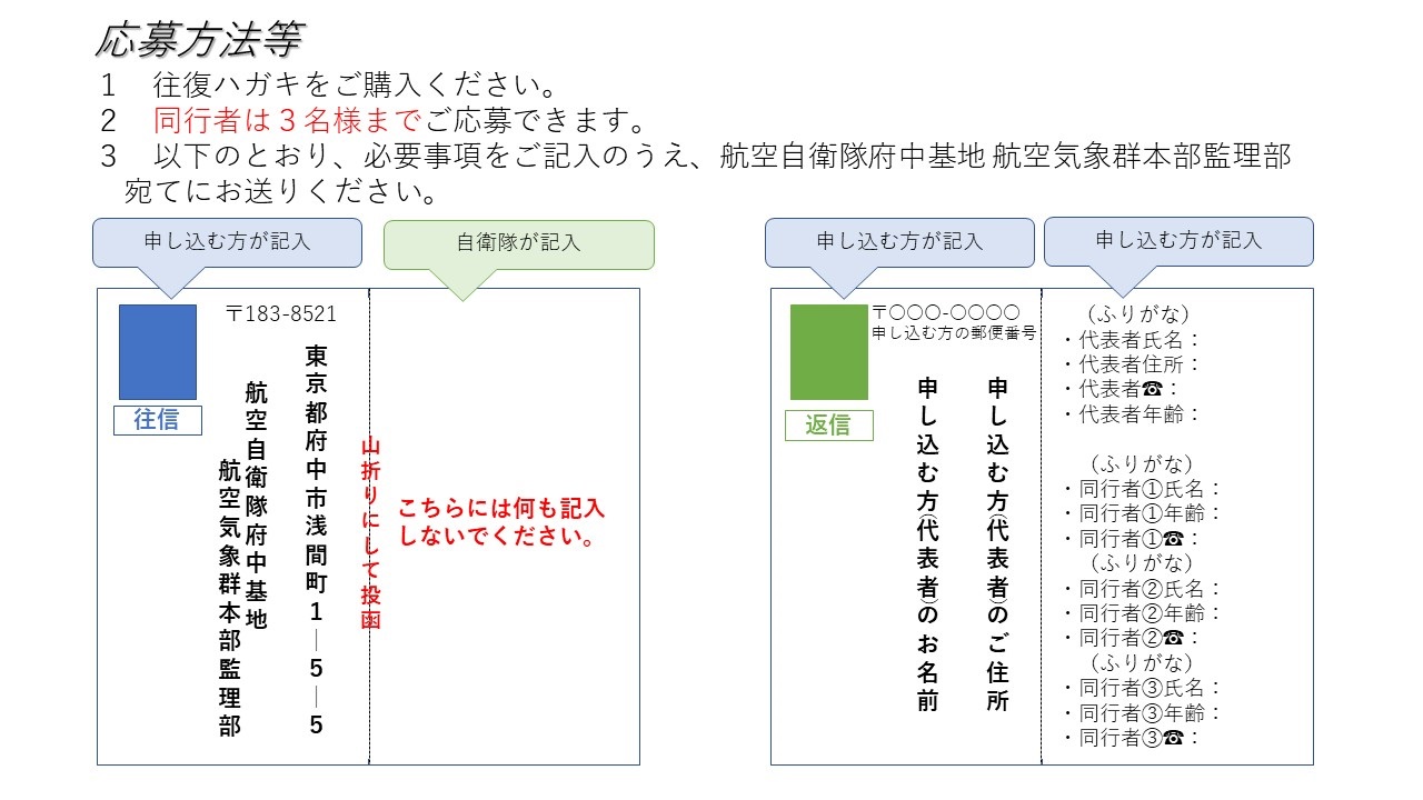 入場には、府中基地への 往復ハガキ による申し込みが必要ですので、応募要項をご確認の上でお申し込みください。