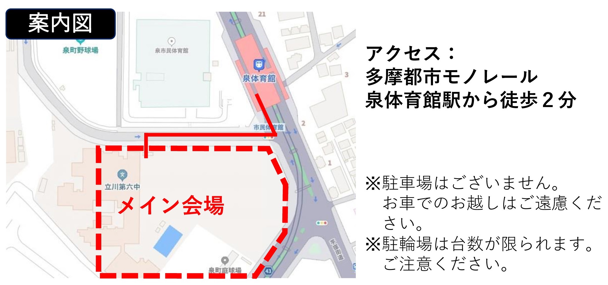 - ●多摩モノレール「泉体育館駅」~ 徒歩約2分(約150m)