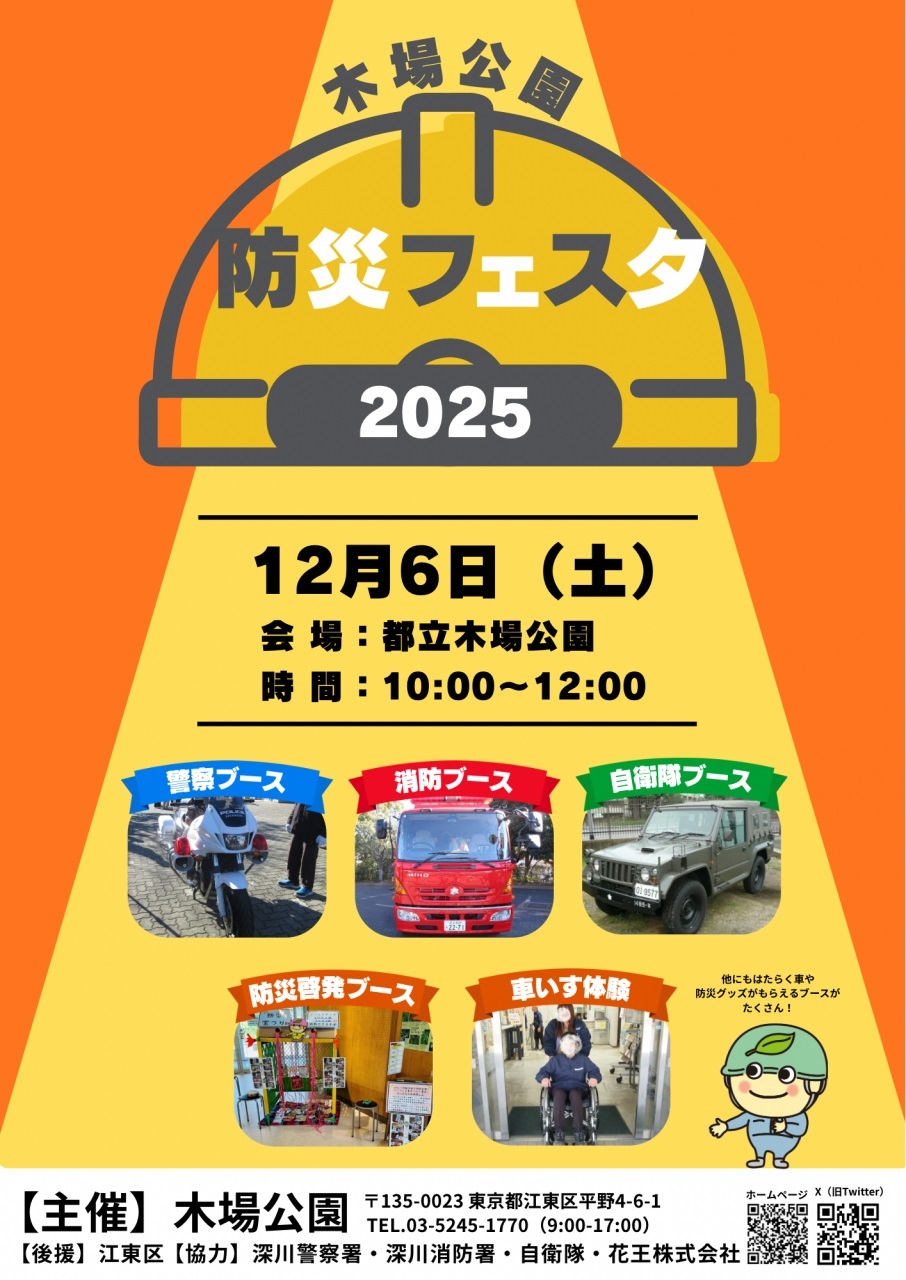 2025年12月6日(土)に、東京都 江東区 木場にある 木場公園 南地区 ミドリアム周辺を会場に「木場公園 防災フェスタ2025」が開催されます。