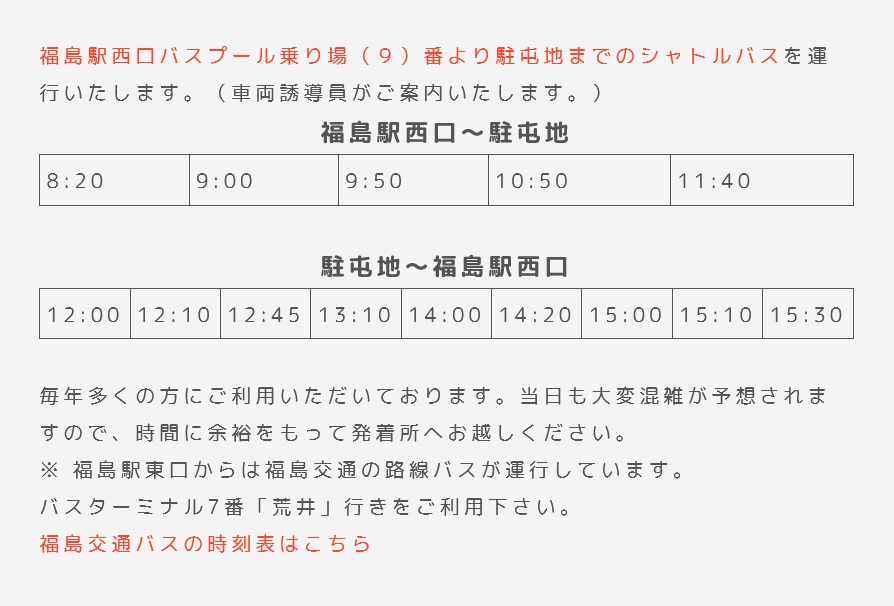 - 「JR福島駅」西口バスプール乗り場 ⑨番 ~ 福島駐屯地までシャトルバスが運行されます。