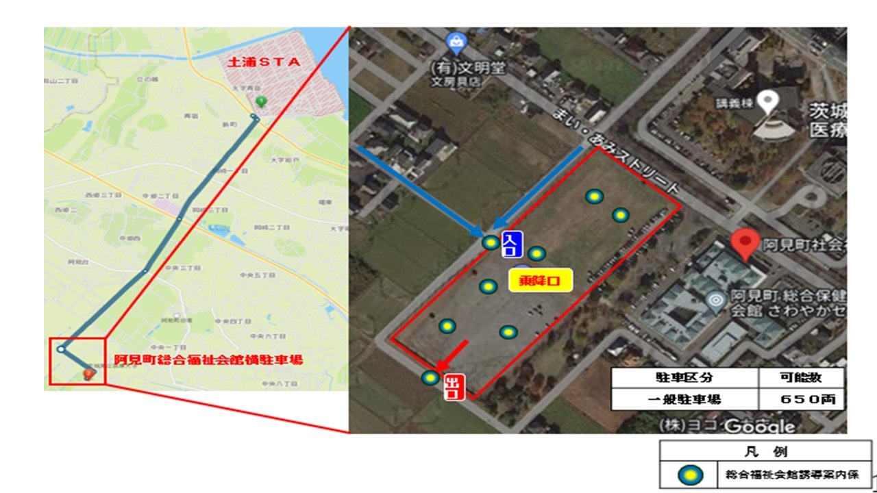 - ※自動車で来場の方は「阿見町総合福祉会館横駐車場」をご利用ください。