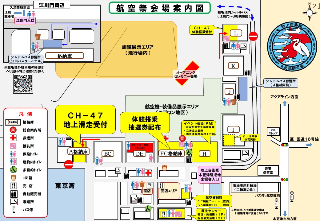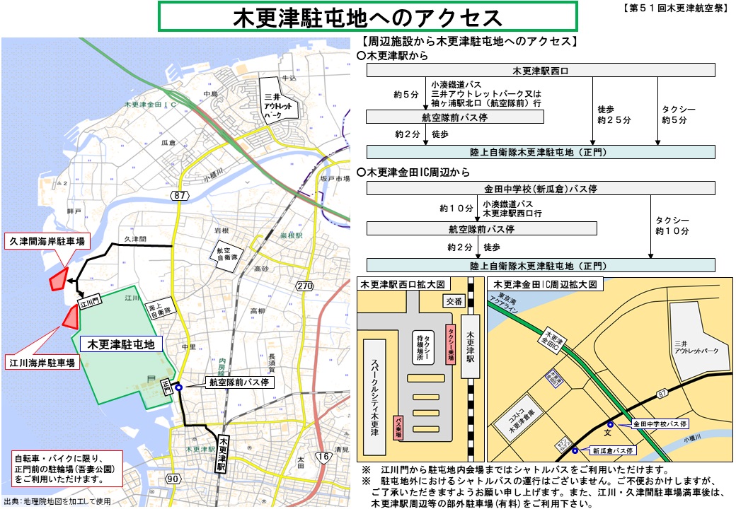 - ※久津間海岸・江川海岸駐車場から駐屯地への入場の際は、駐屯地北西の「江川門」をご利用ください。