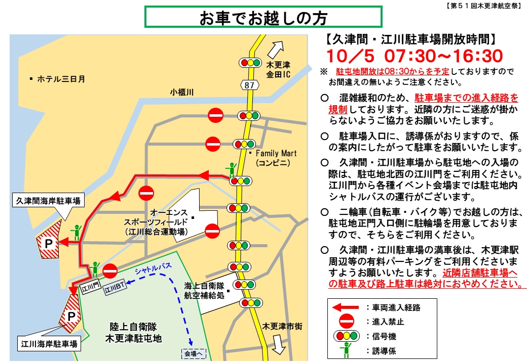 - 自動車の方は「久津間海岸駐車場」又は「江川海岸駐車場」をご利用ください。