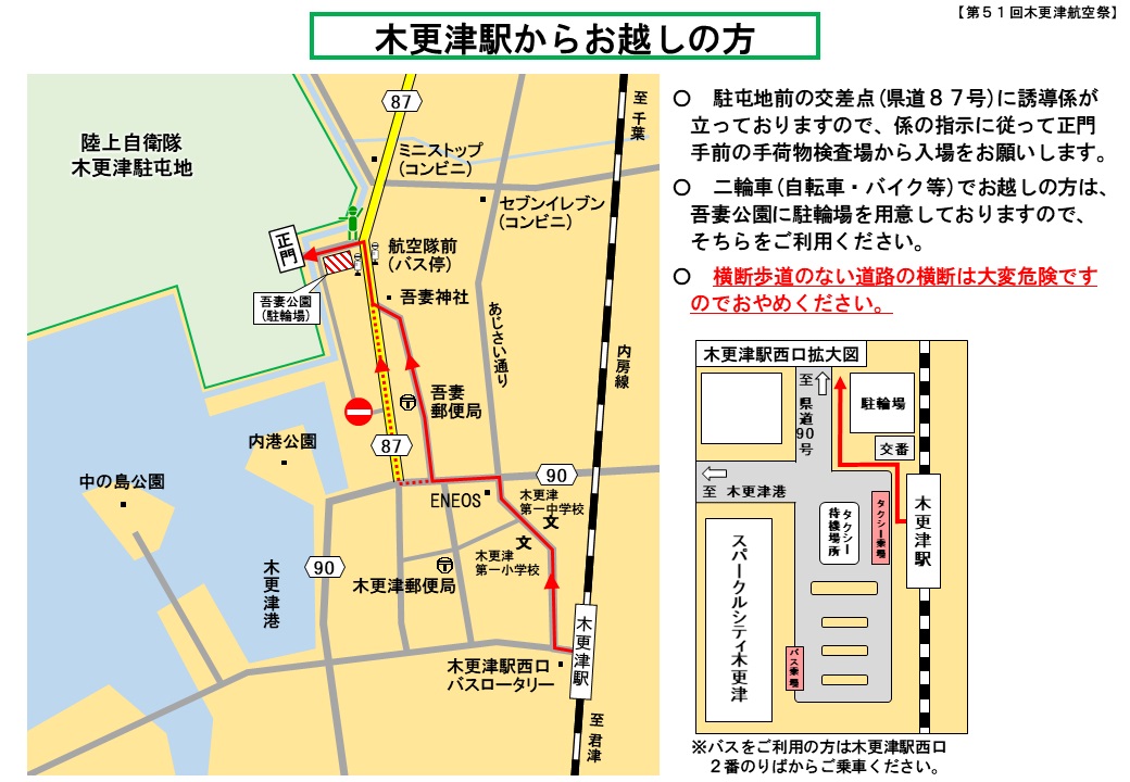 - JR内房線・久留里線「木更津駅」西口 ~ 徒歩約30分(約2.5km)