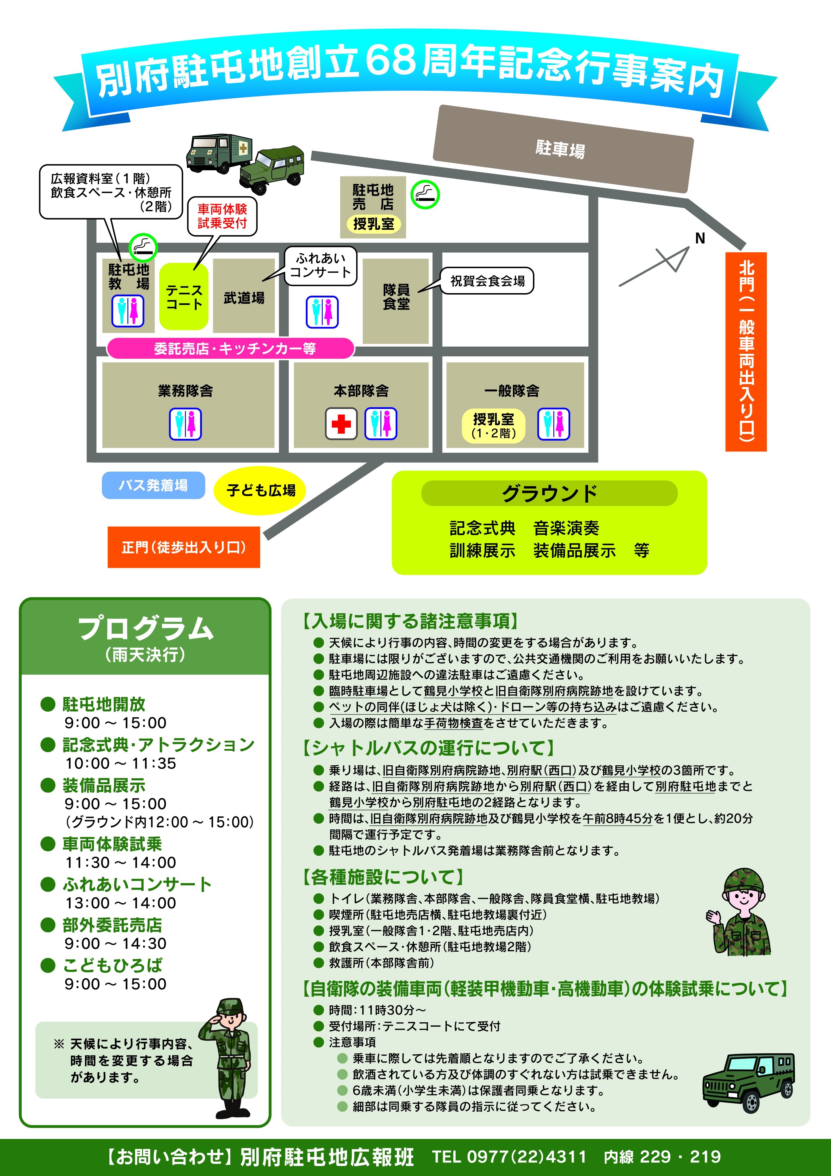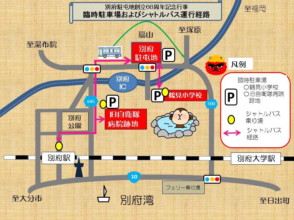 - ※「旧自衛隊別府病院跡地」「別府駅(西口)」「別府市立鶴見小学校」から駐屯地までシャトルバスが運行されます。