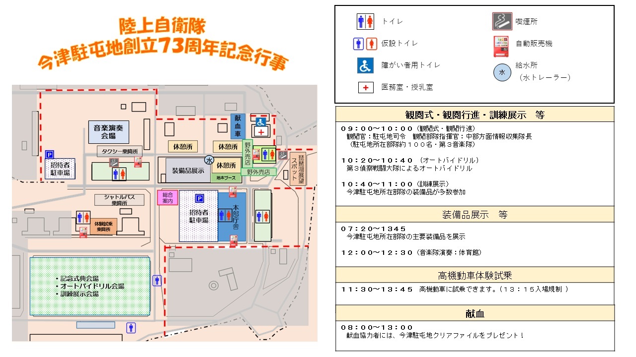 - ※臨時駐車場(南側)、JR近江今津駅から駐屯地までシャトルバスが運行されます。