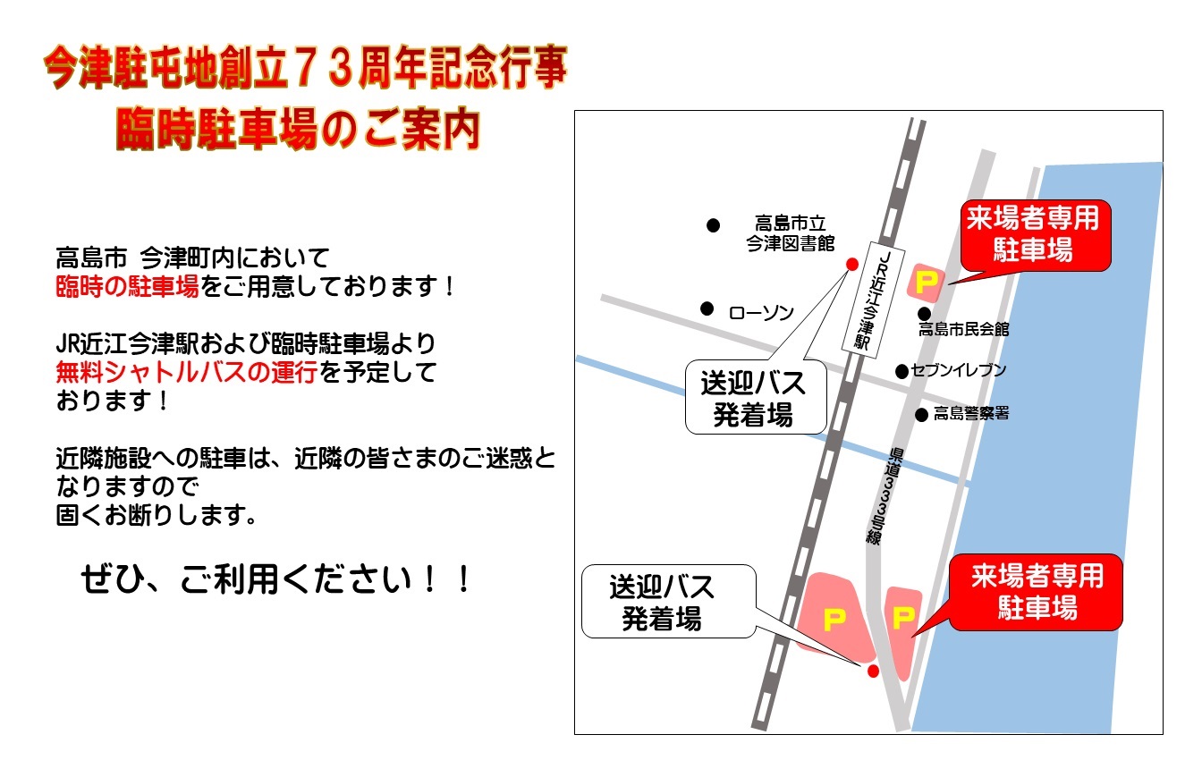 - 今津駐屯地内に一般駐車場はありませんので、今津町内の臨時駐車場をご利用ください。