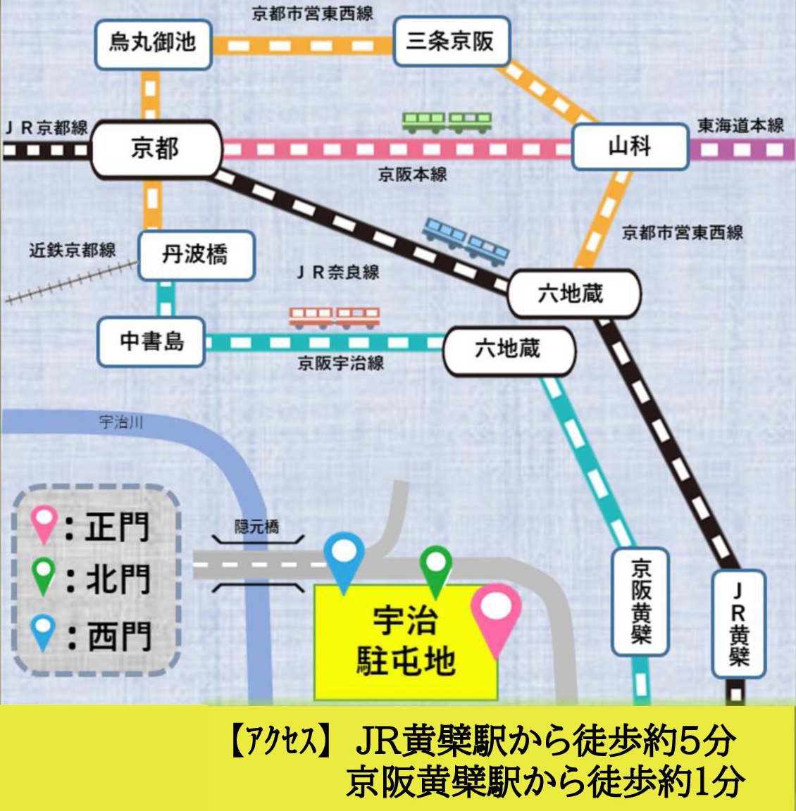 - ●JR「黄檗駅(おうばくえき)」~ 徒歩約5分(約200m)