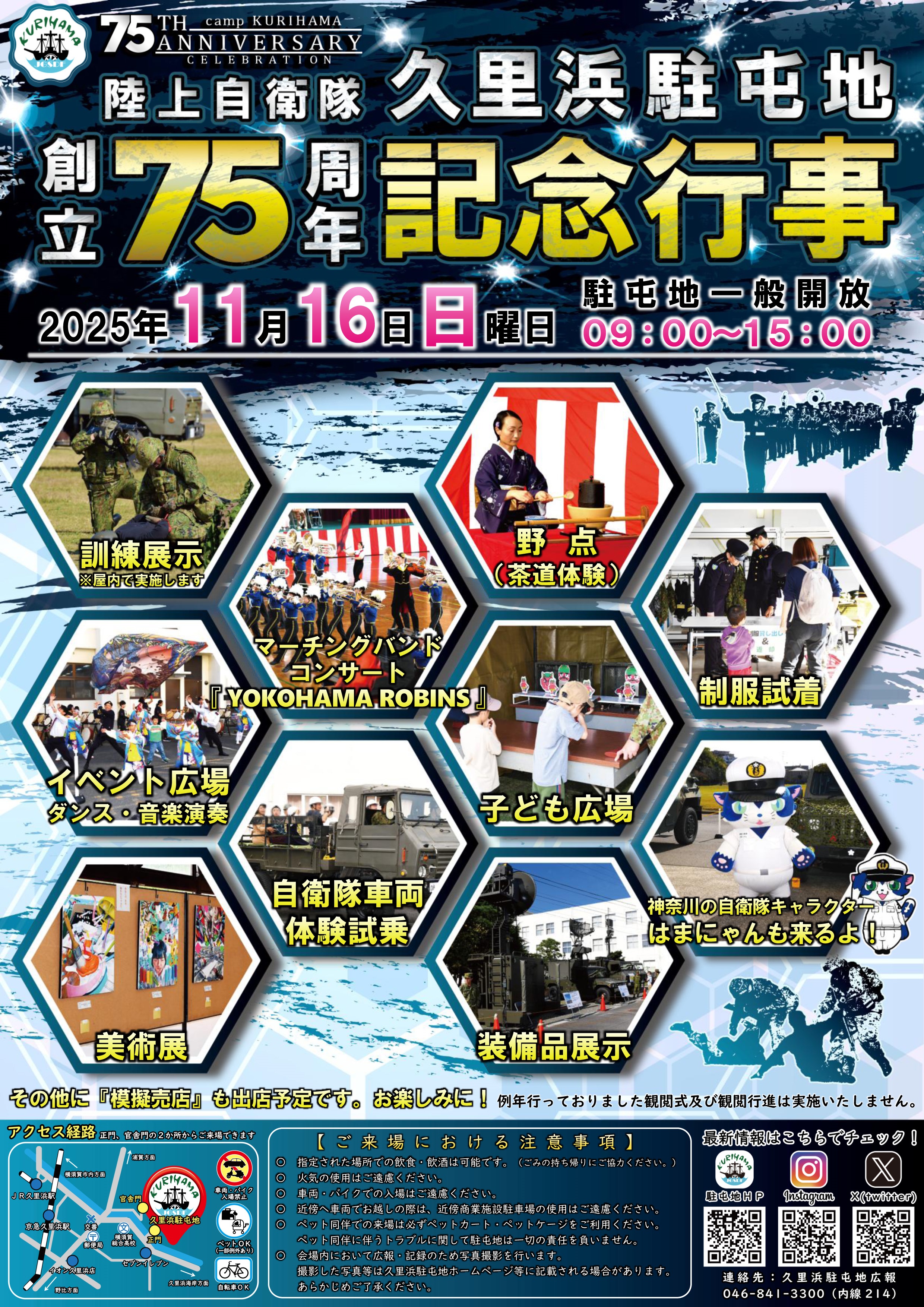2025年11月16日(日)に、神奈川県 横須賀市にある 陸上自衛隊 久里浜駐屯地で「久里浜駐屯地 創立75周年記念行事」が実施されます。