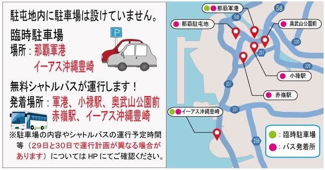 - ●駐屯地内に駐車場はありませんでの、駐屯地外の臨時駐車場や無料シャトルバスをご利用ください。