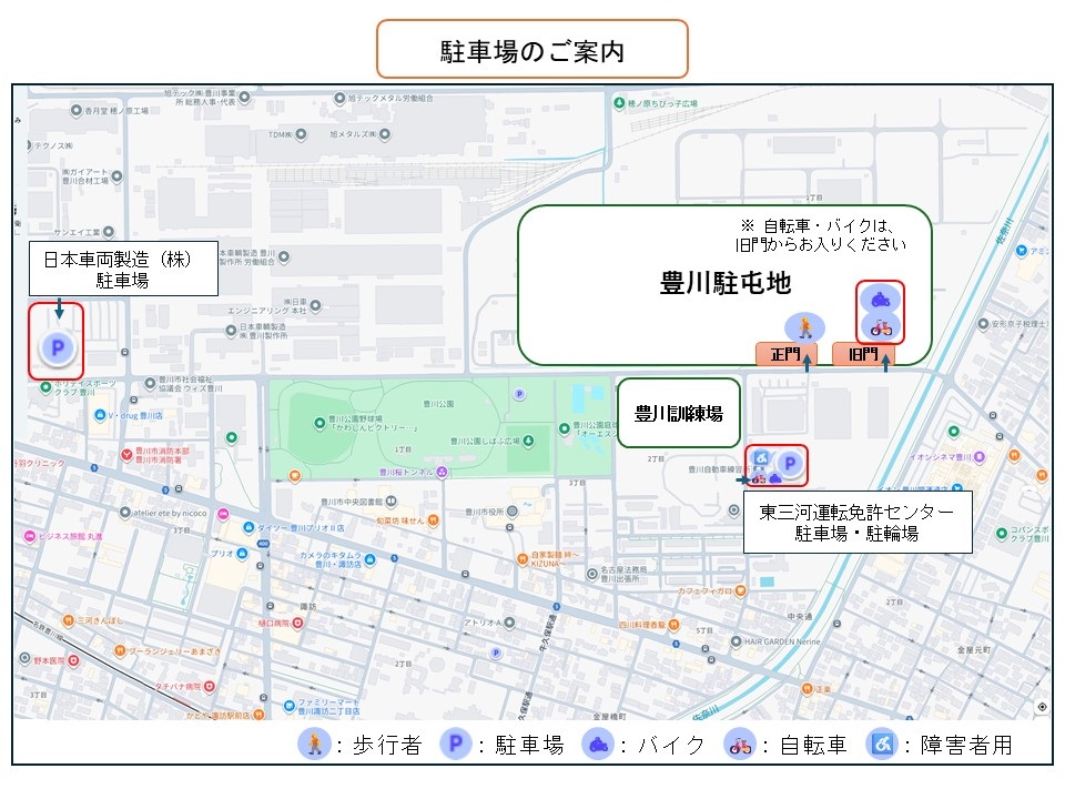 - ※自動車で来場の方は「東三河運転免許センター駐車場」「日本車両製造(株)駐車場」が利用できます。