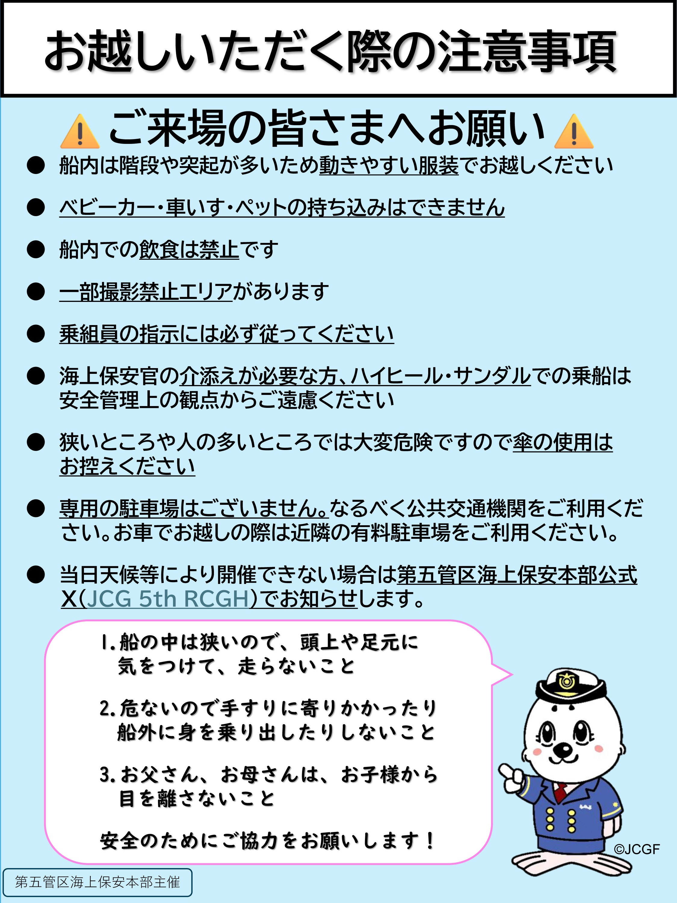 - ※海上保安官の介助が必要な方、ハイヒールやサンダルの方は、安全管理上の観点から、乗船をご遠慮ください。