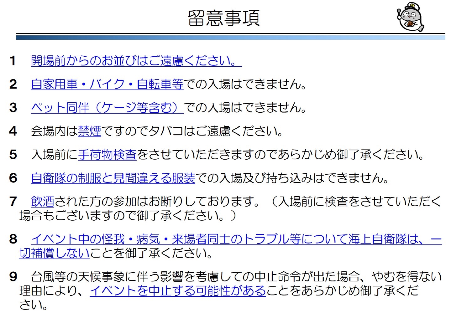 - ※イベント中のケガ、病気、来場者同士のトラブル等については、海上自衛隊は一切補償いたしません。