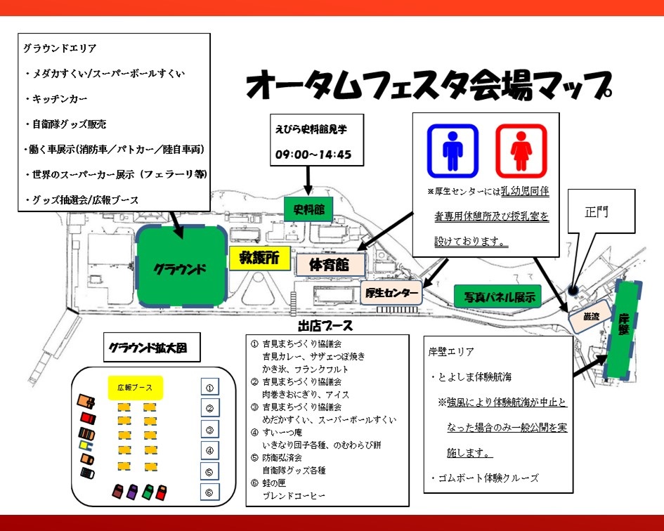 掃海艇「とよしま」の体験航海、ゴムボート港内クルーズ、はたらく車展示、キッチンカーなどが行われますので、是非ご来場ください。