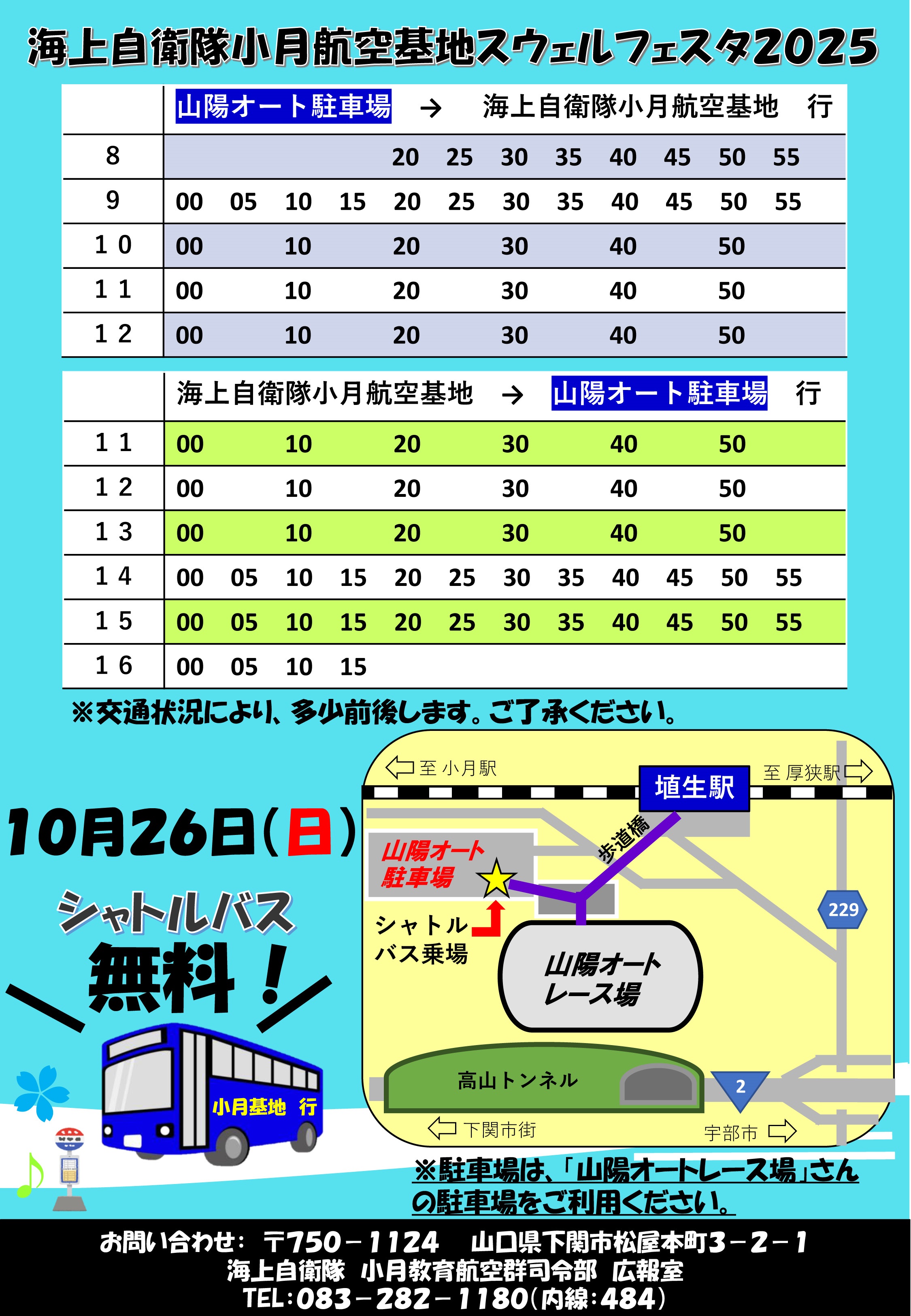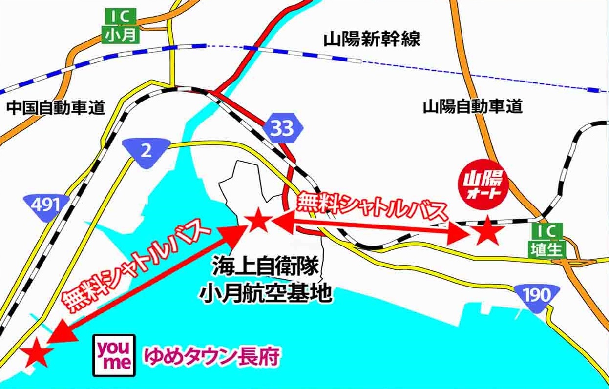 - ※当日は「ゆめタウン長府」「山陽オートレース場」から基地まで無料シャトルバスが運行されます。