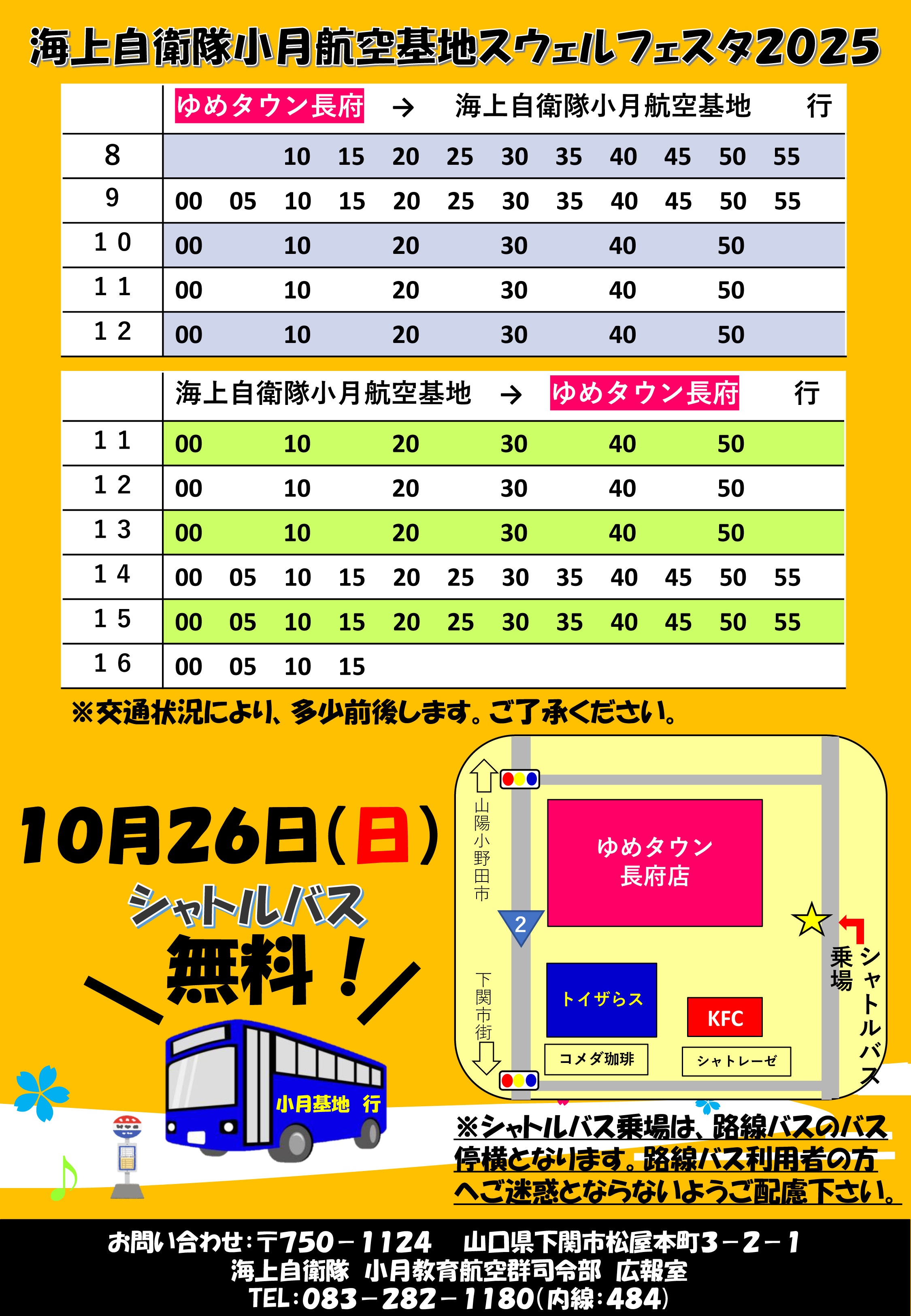 - ・シャトルバス①:「ゆめタウン長府」~ 小月航空基地