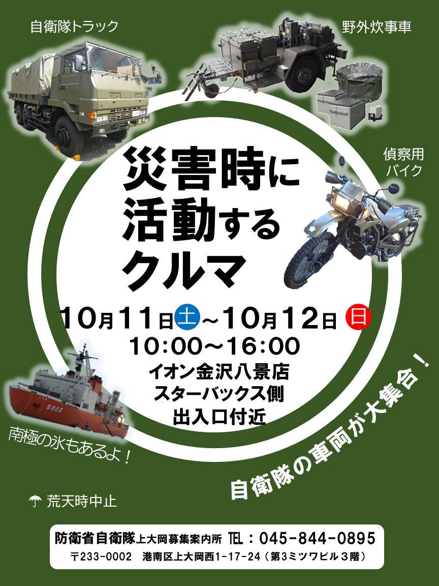 自衛隊神奈川地方協力本部 上大岡募集案内所 により自衛隊車両展示や広報ブースなどが行われます。