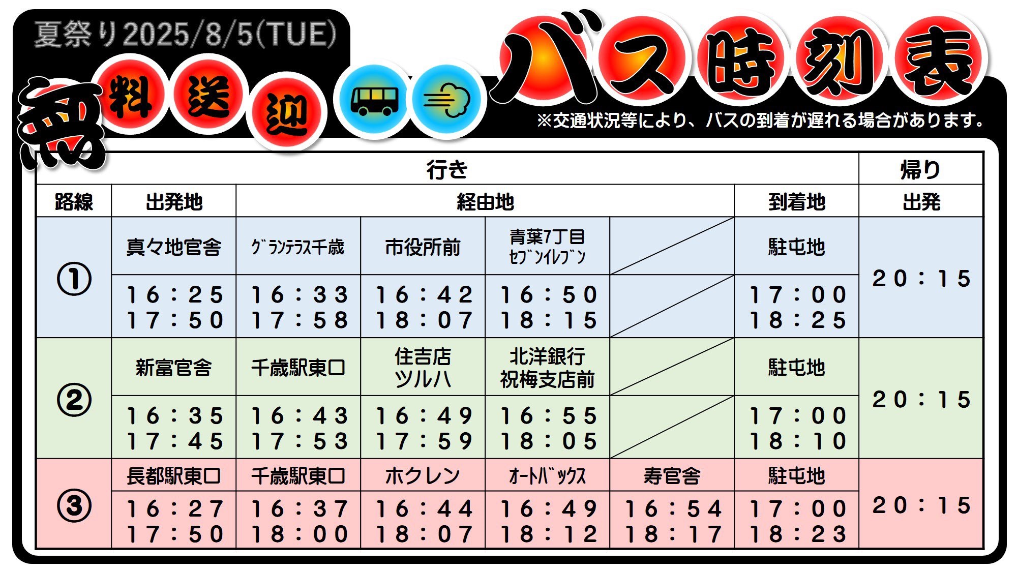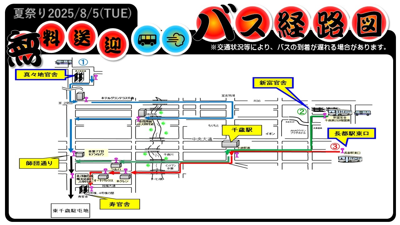- ・バス経路③:「JR長都駅」~「JR千歳駅 東口」~「ホクレン」~「オートバックス」~「寿官舎」~「東千歳駐屯地」