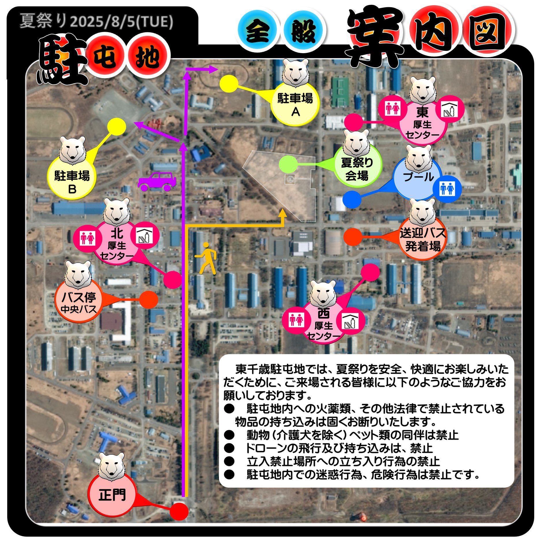 - ●当日は千歳市内の各場所から東千歳駐屯地まで無料送迎バスが運行される予定です。