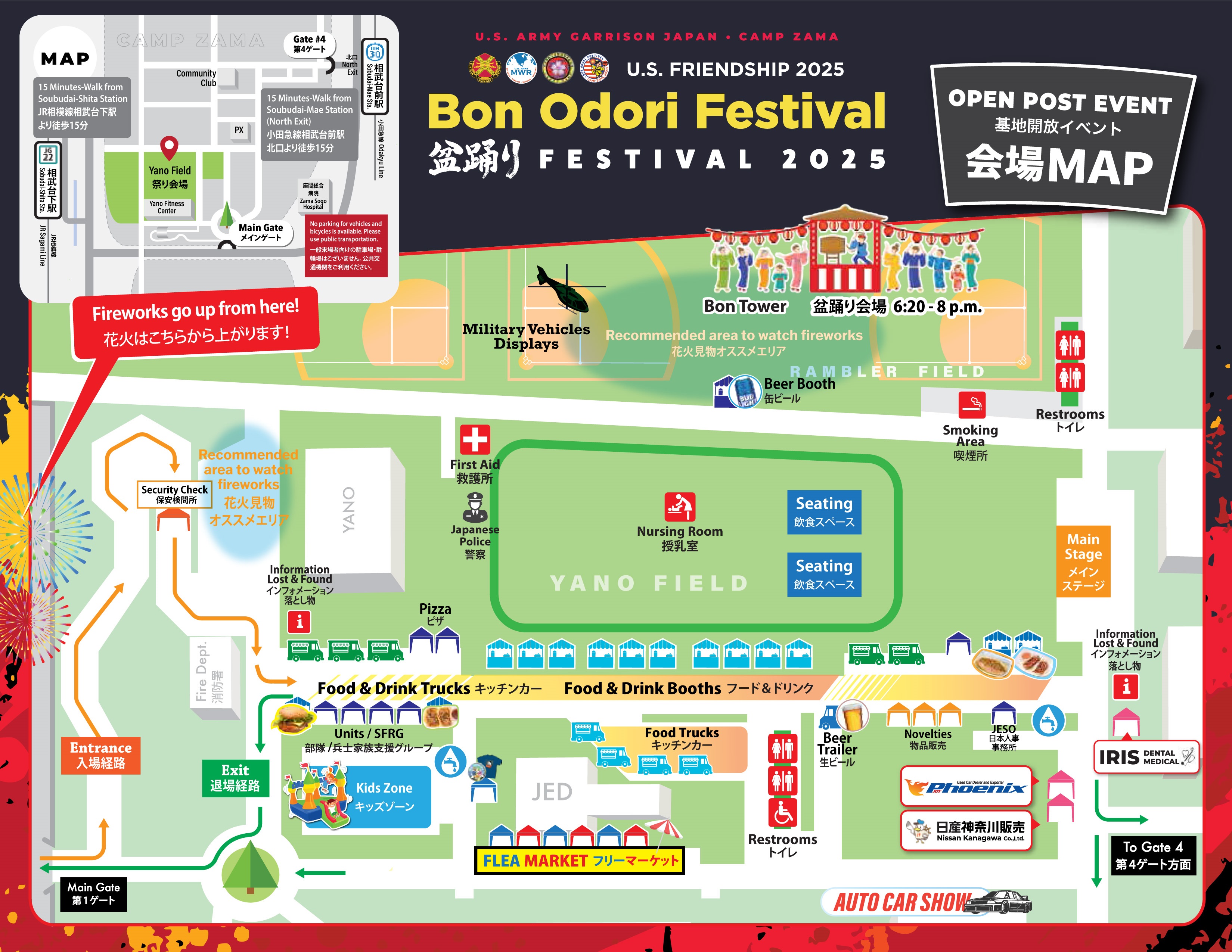 令和6年は、2024年8月3日(土)に「在日米陸軍キャンプ座間 日米親善 盆踊りフェスティバル2024」として開催され、盆踊り、キッズゾーン、打ち上げ花火などが行われました。