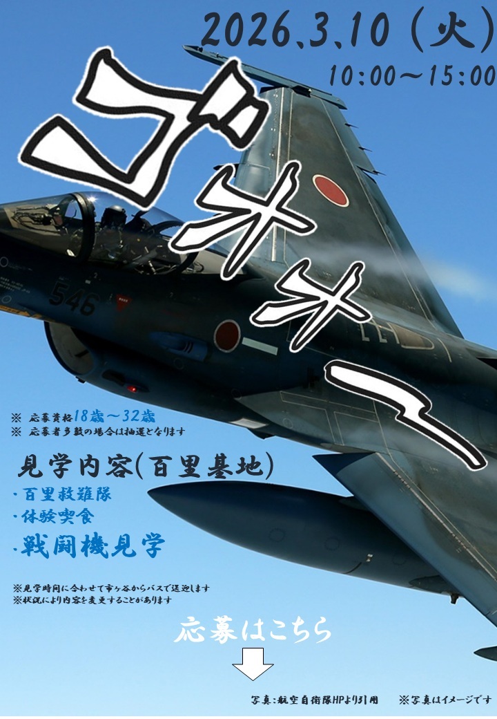 18歳~32歳までの方を対象に、戦闘機見学、百里救難隊見学、体験喫食などが行われますので、参加希望の方は、応募要項をご確認の上でお申し込みください。