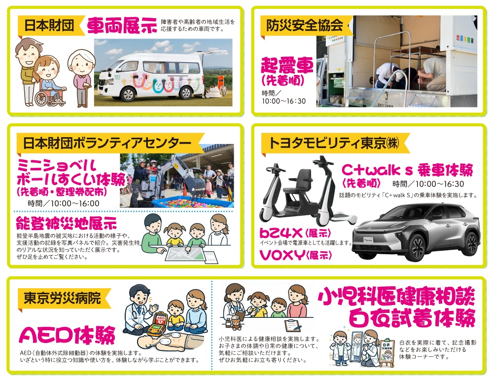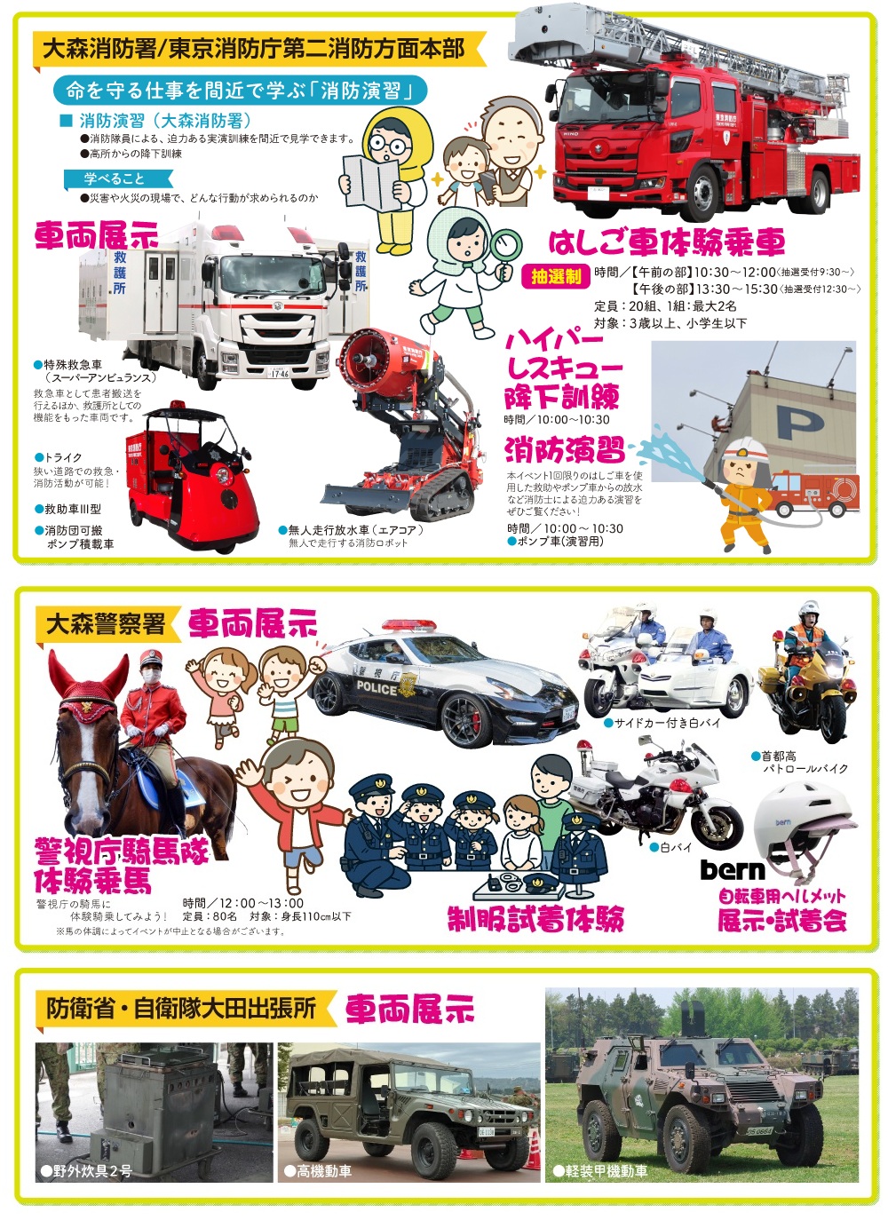 陸上自衛隊・東京消防庁・警視庁等による働く車の展示、ステージイベント、キャラクターイベントなどが行われますので、是非ご来場ください。