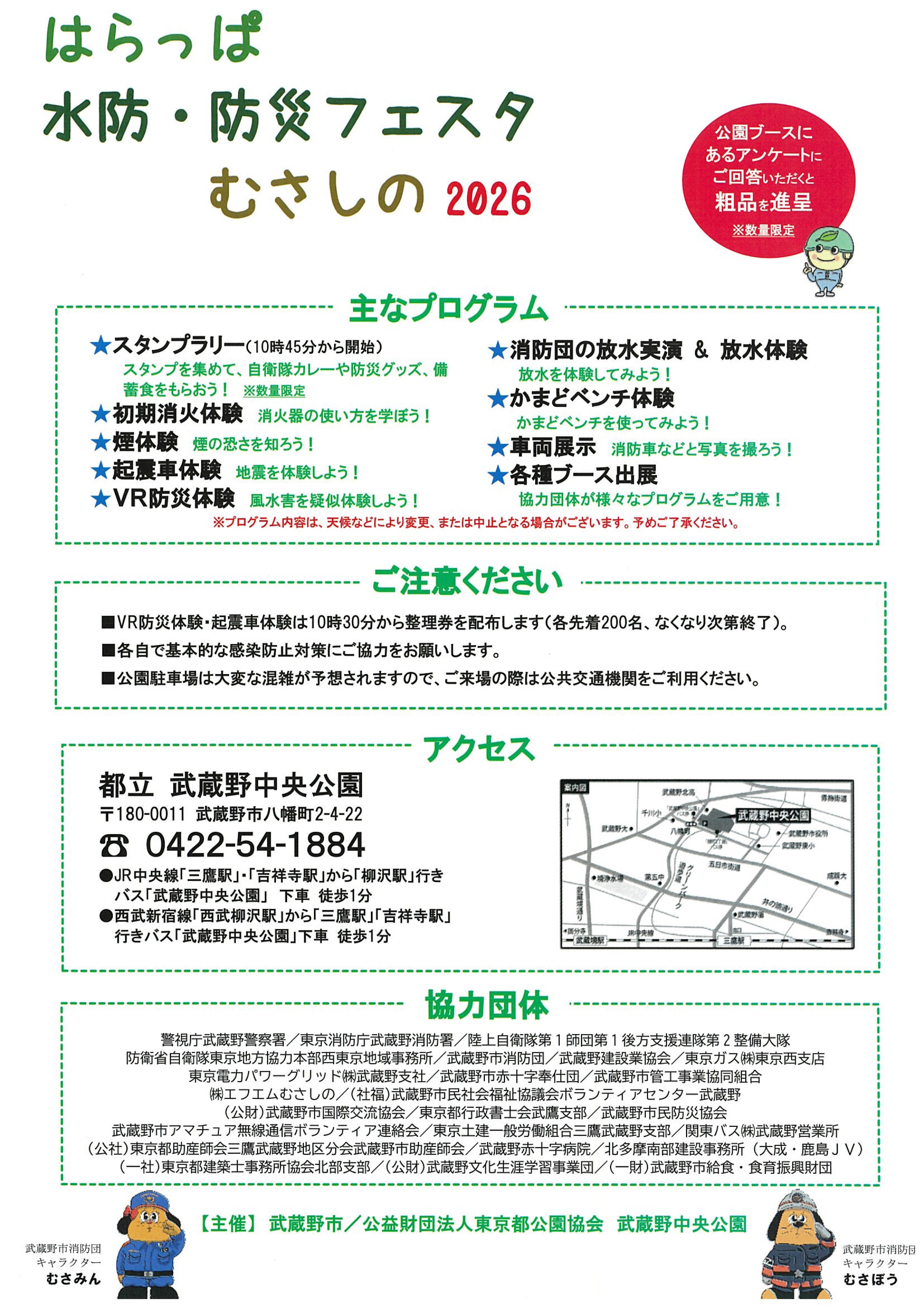 東京都 武蔵野市 八幡町にある 武蔵野中央公園で「はらっぱ水防・防災フェスタむさしの2026」が実施されます。