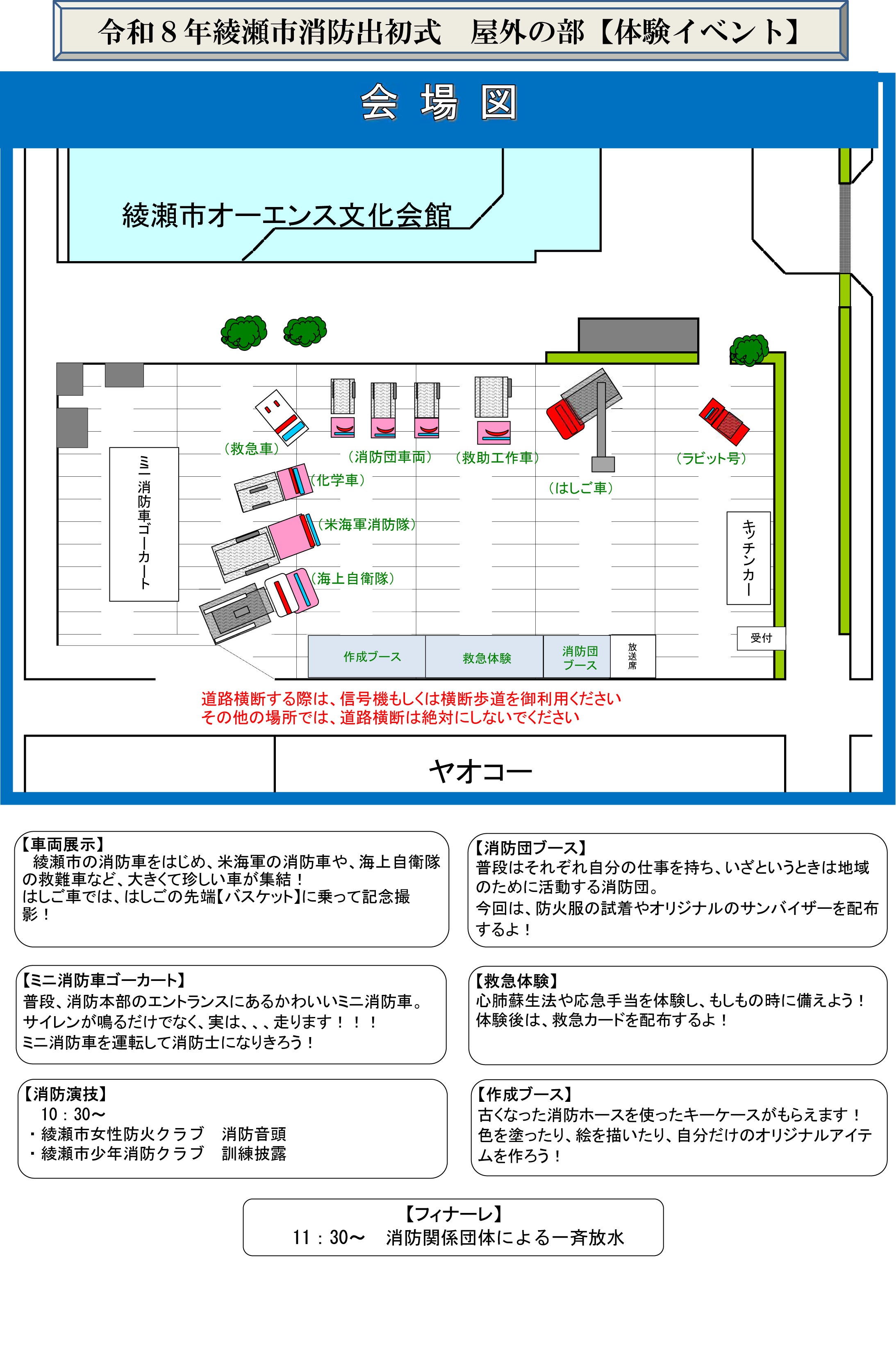屋外の部では、綾瀬市民文化センター 第1駐車場で、消防車両展示、防災体験、特設ステージ、消防演技などが行われますので、是非ご来場ください。