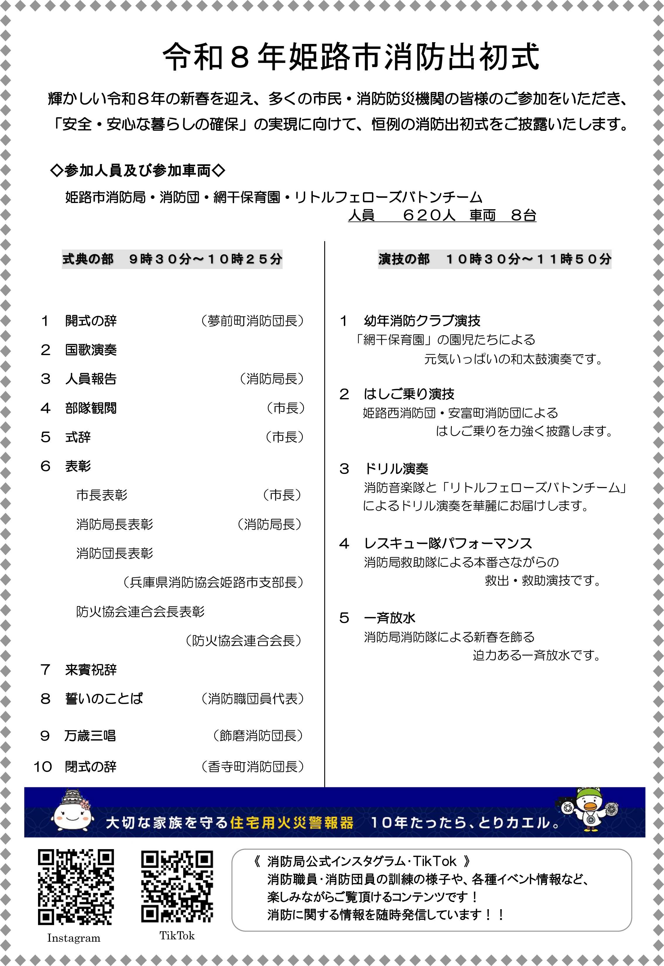 2026年1月11日(日)に、兵庫県 姫路市にある 姫路城 三の丸広場で「令和8年 姫路市消防出初式」が開催されます。 式典、はしご乗り演技、消防音楽隊ドリル演技、レスキュー隊パフォーマンス、一斉放水などが行われますので、是非ご来場ください。
