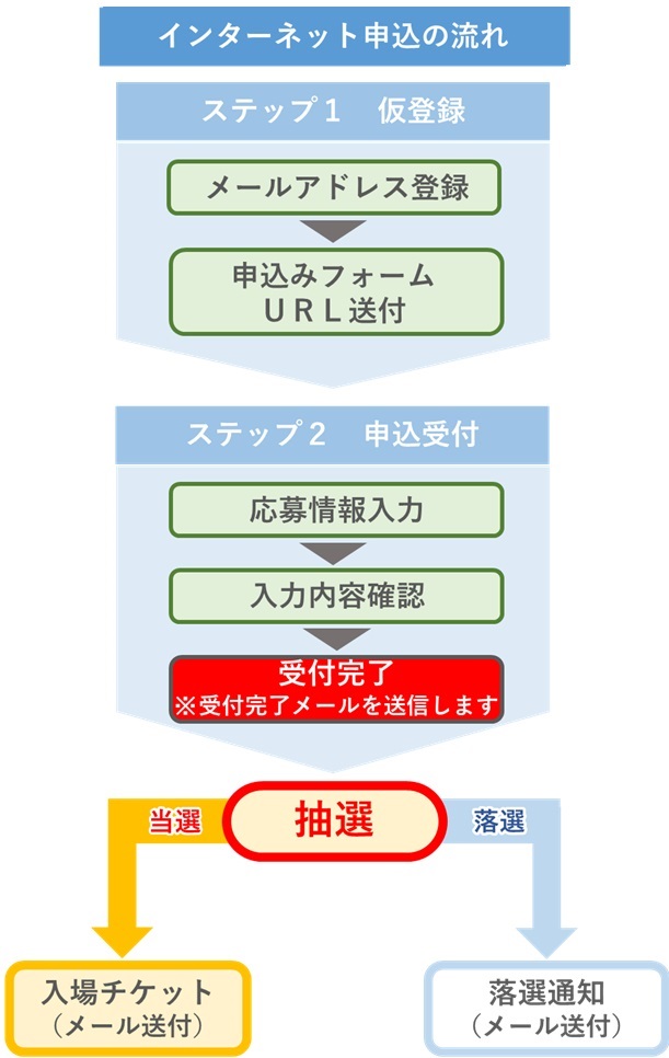 - ※インターネット 及び 郵便ハガキの重複申込み、同一世帯の複数応募は、インターネット申し込みのみが有効となります。