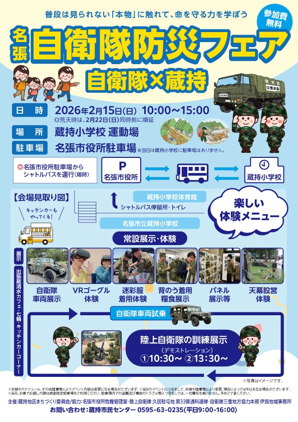 2026年2月15日(日)に、三重県 名張市 蔵持町にある 名張市立蔵持小学校で「名張自衛隊防災フェア2026」が開催されます。