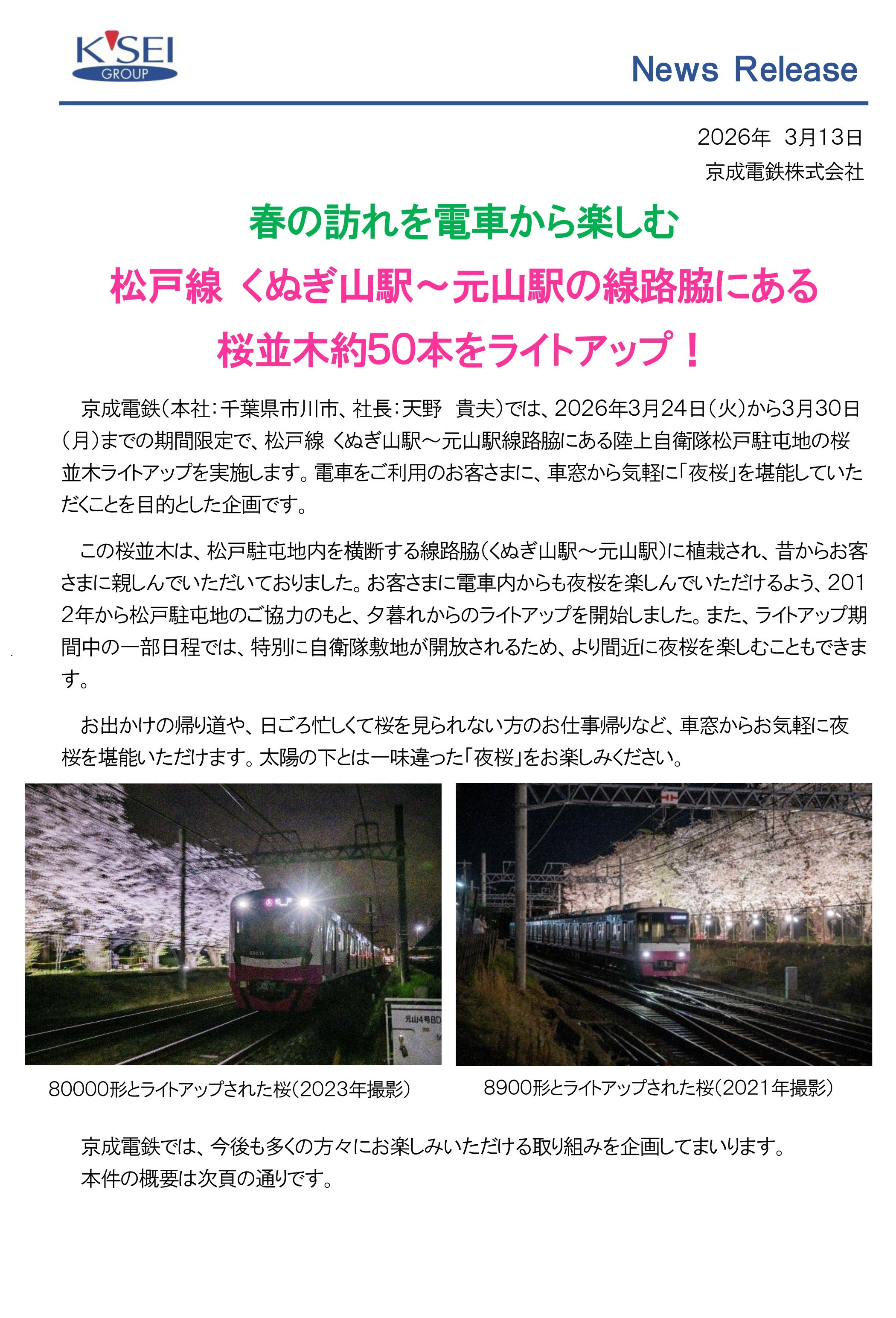 2026年3月24日(火)~30日(月)の期間で、京成電鉄の「元山駅」~「くぬぎ山駅」間にある、松戸駐屯地内に咲く桜並木が夜間ライトアップされます。