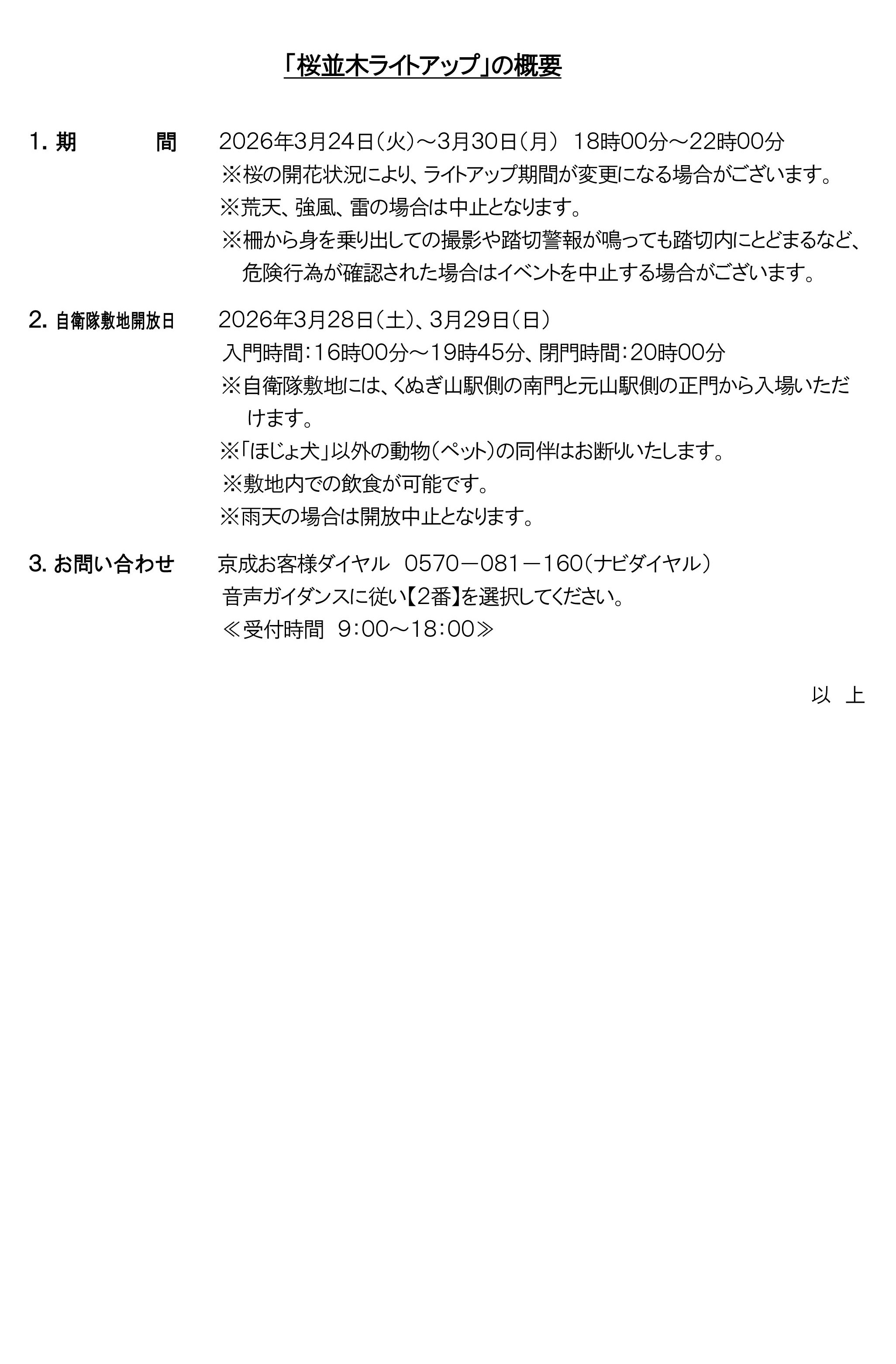 2026年3月24日(火)~30日(月)の期間で沿線の桜並木ライトアップ、3月28日(土)・29日(日)には駐屯地の一部を一般開放して装備品展示や夜桜見学ができますので、是非ご来場ください。