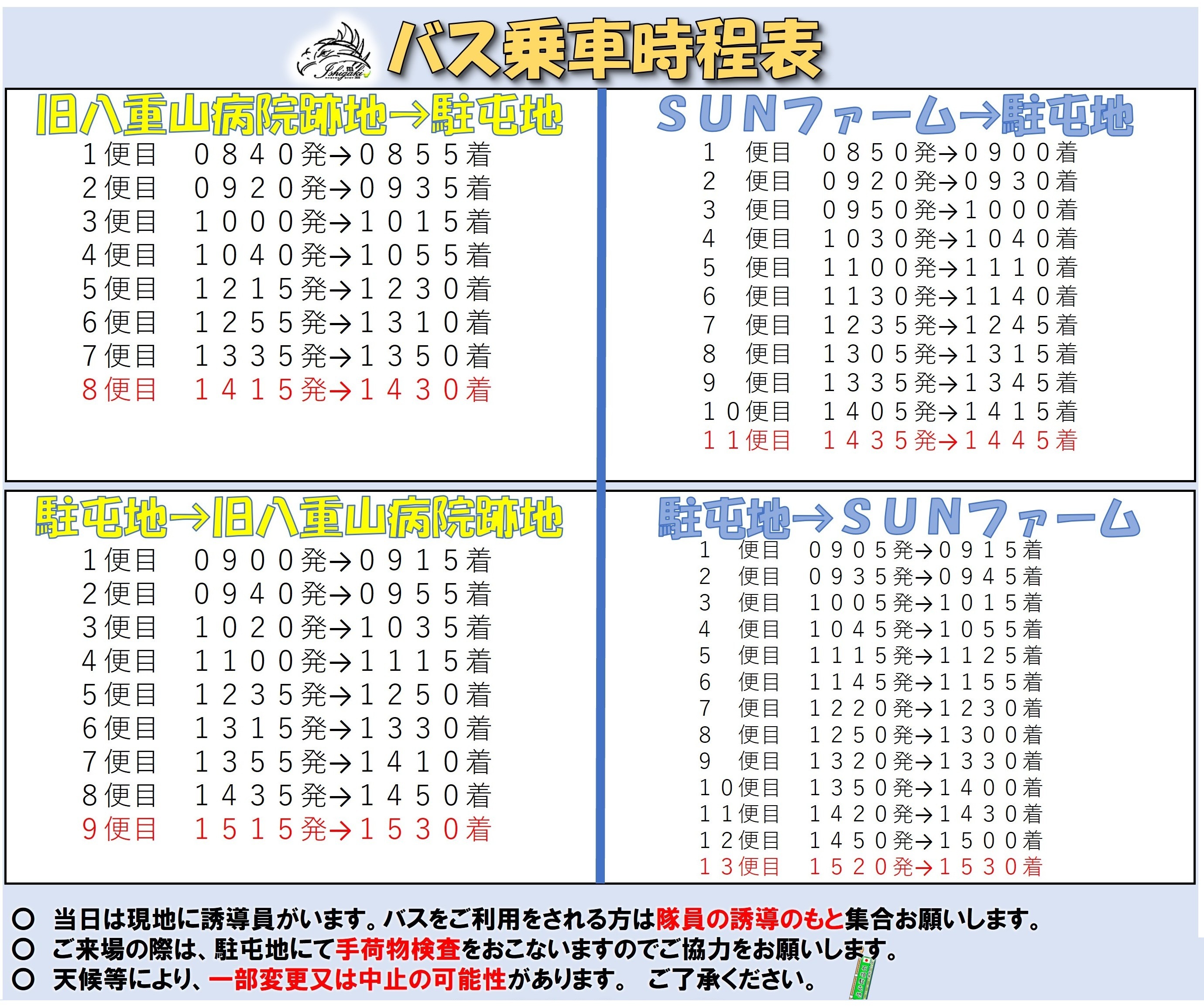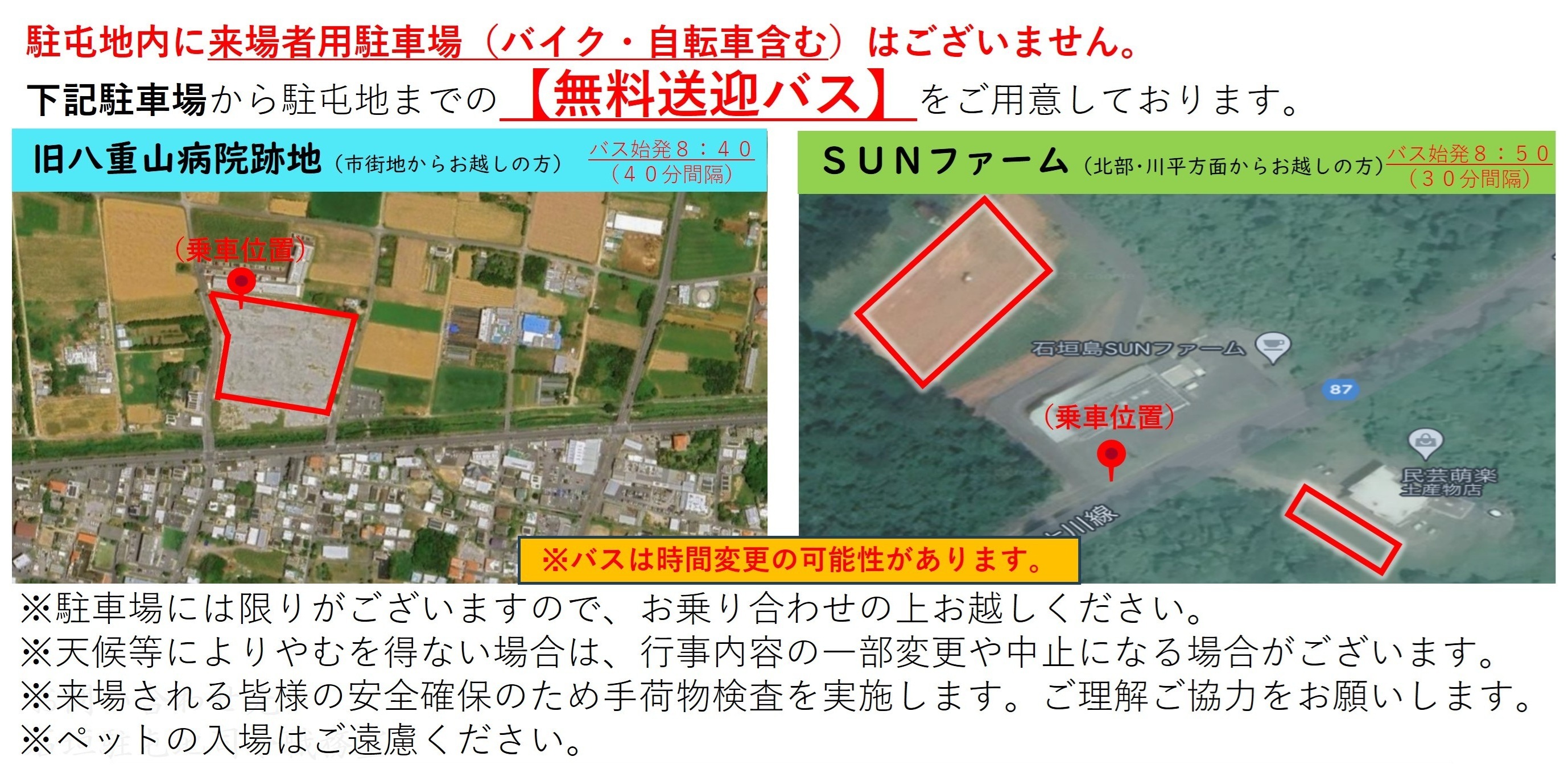 - ※自動車・バイク・自転車で来場の方は「旧八重山病院跡地」「石垣島SUNファーム」の駐屯地外駐車場をご利用ください。