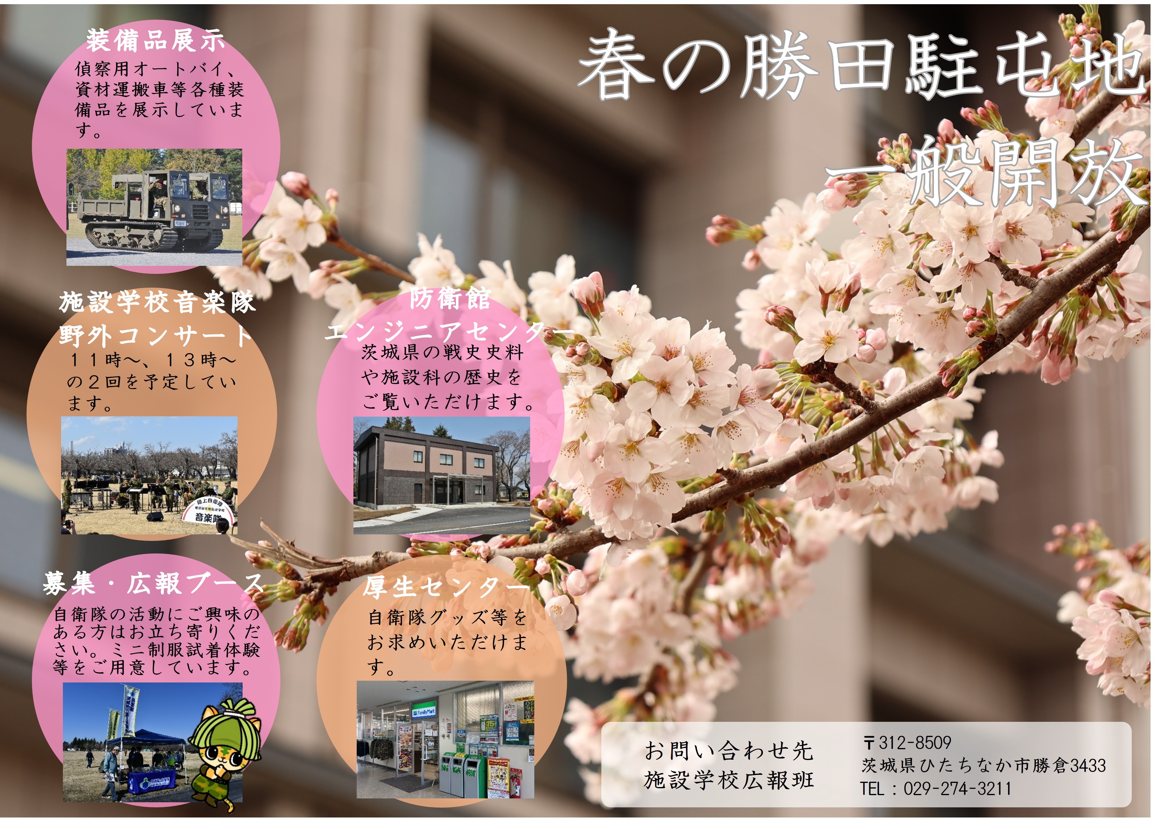 令和6年は、2024年3月30日(土)・31日(日)に「令和6年 陸上自衛隊 勝田駐屯地 観桜一般開放」として実施され、装備品展示、音楽隊演奏、売店利用などが行われました。