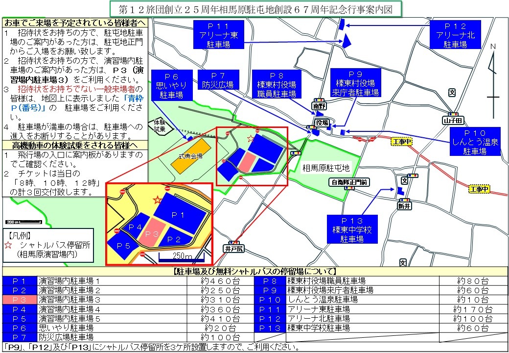- 当日は以下の場所から演習場までシャトルバスが運行されます。