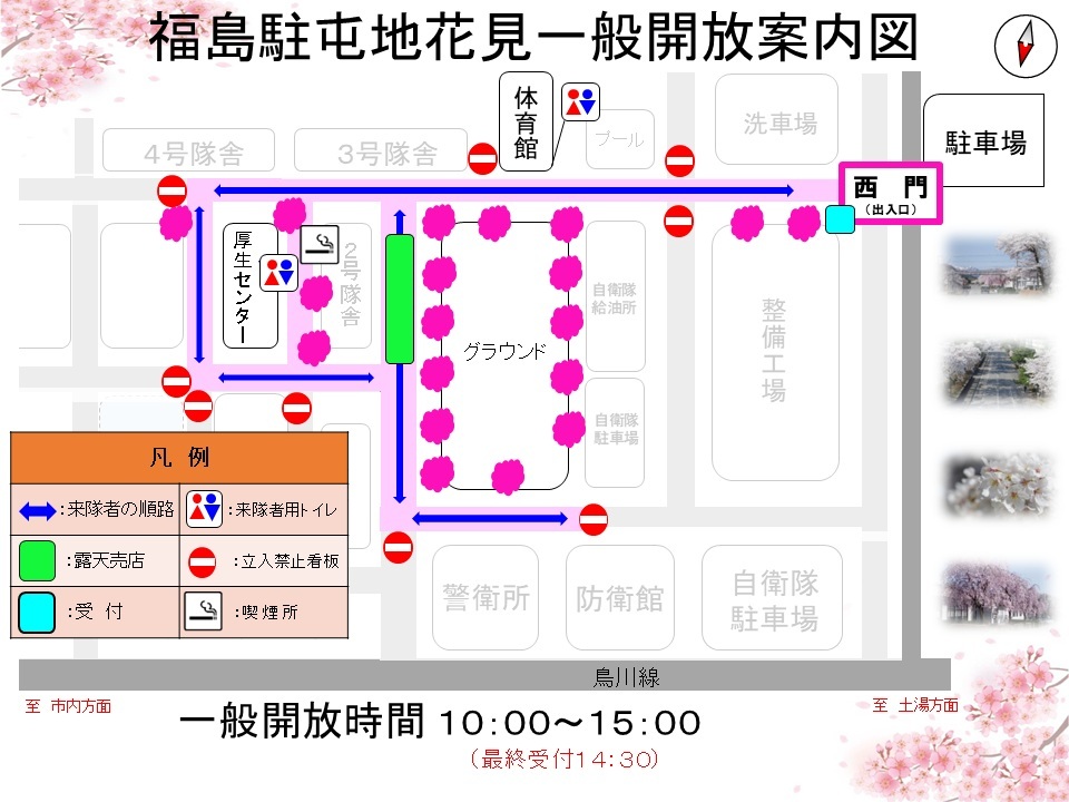 令和5年は、2023年4月8日(土)に「陸上自衛隊 福島駐屯地 花見一般開放2023」として実施され、駐屯地内の観桜、資料館見学、売店利用などが行われました。