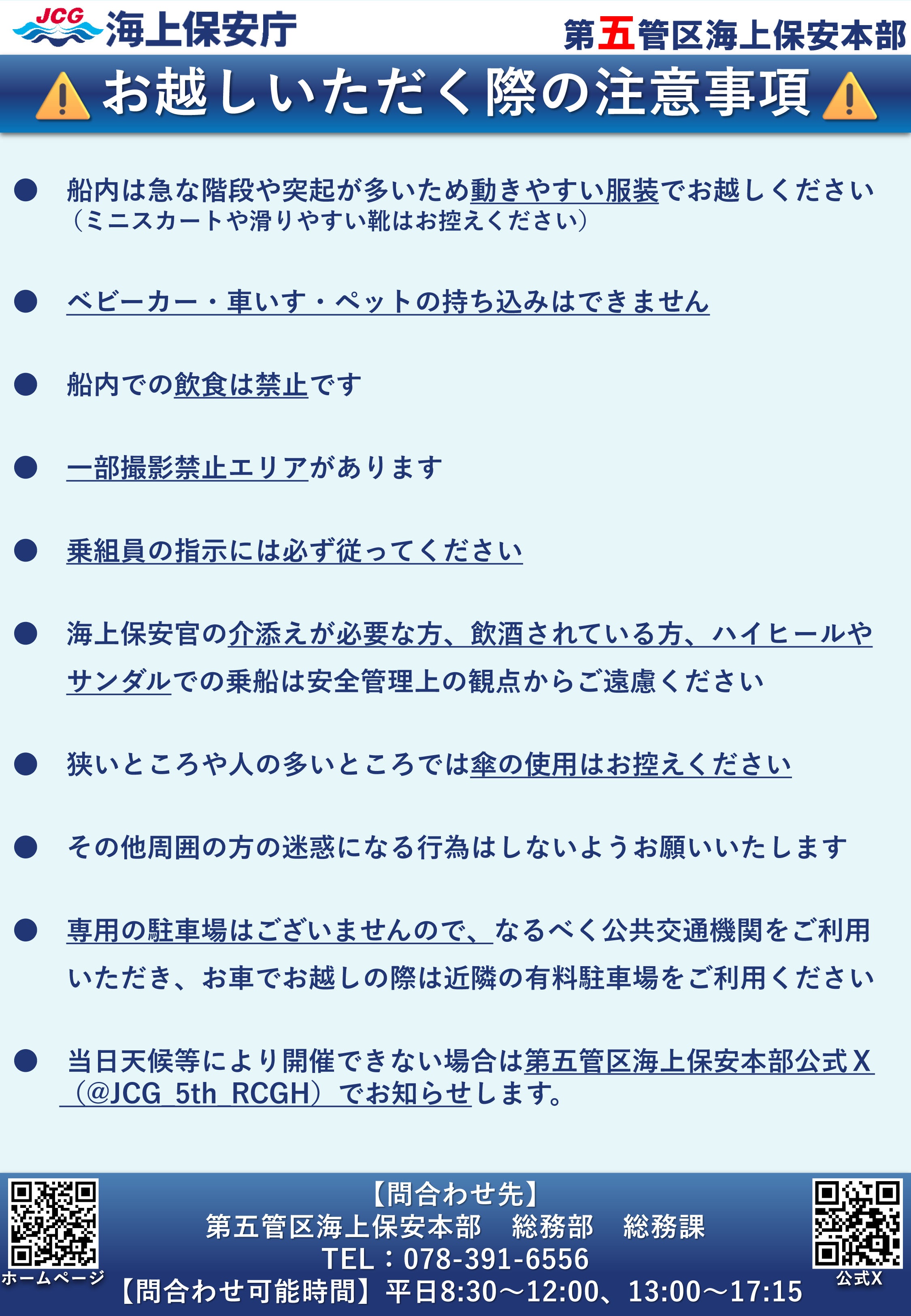 - 当日、天候等の状況により開催できない場合は、第五管区海上保安本部公式Xでお知らせがあります。